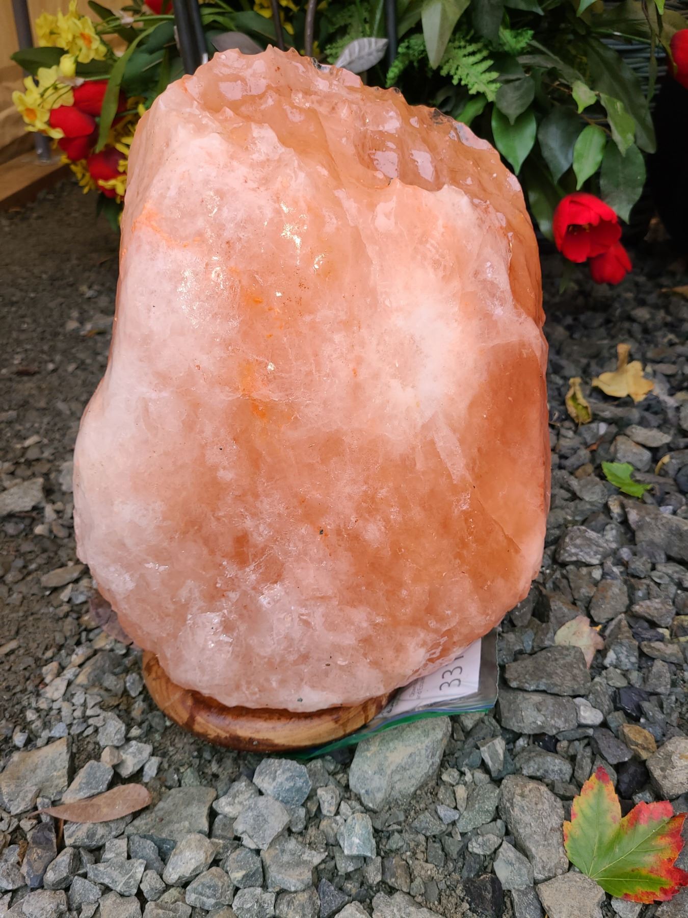 Large Decorative salt crystal on wood base about 12 - 14 inches tall. Has cut out in base to place lamp. Very heavy. Pickup at 9 am