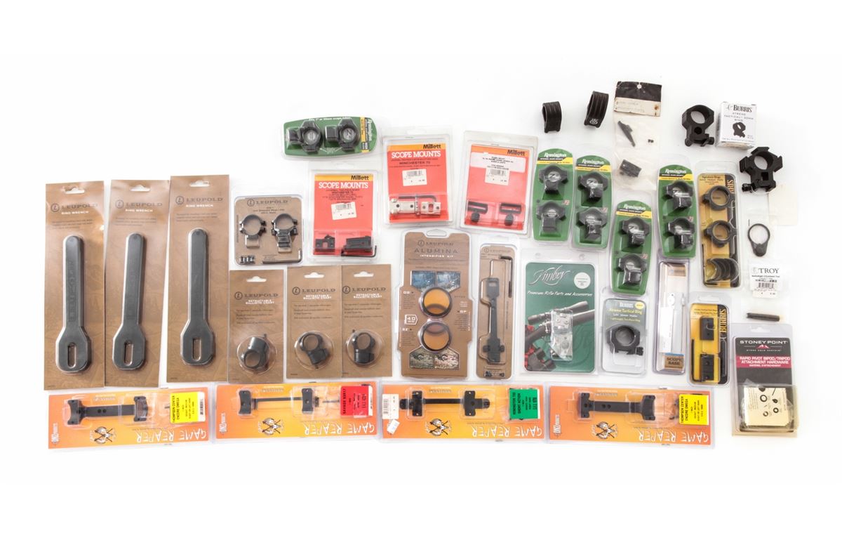 Large Lot of Scope Rings and Bases, including DNZ Product Grim Reaper Muonts for Rem. 700 short action, Savage 93R17, and two for Thompson Center Encore Omega; five (5) Remington integral scope mounts for Model 700 rifles; Kimber scope base set (Montana SST 8400); Stoney Point rapid pivot bipod/tripod attachment hardware; Burris Xtreme tactical steel base for Savage short/long flat rear; two (2) Burris Xtreme tactical rings, low 30mm matte; B-Square scope base Ruger to Weaver Adapter SS; Millett flush mount sling swiel combo; two (2)Millett two-piece custom sculptured bases for Win. 70 (nickel and black); Burris signature rings, 30mm medium matte, universal dovetail; three (3) Leupold ring wrenches; three (3) Leupold bases for Browning BAR #49985; three (3) Leupold retractable ballistic charts; Leupold Low Extension rings, #49910 matte; Leupold Alumina intensifier kit, etc. All brand new in original packaging. Some packages show wear. Retails @ over $800/lot. Est.: $500-$700/lot. (Field Time)