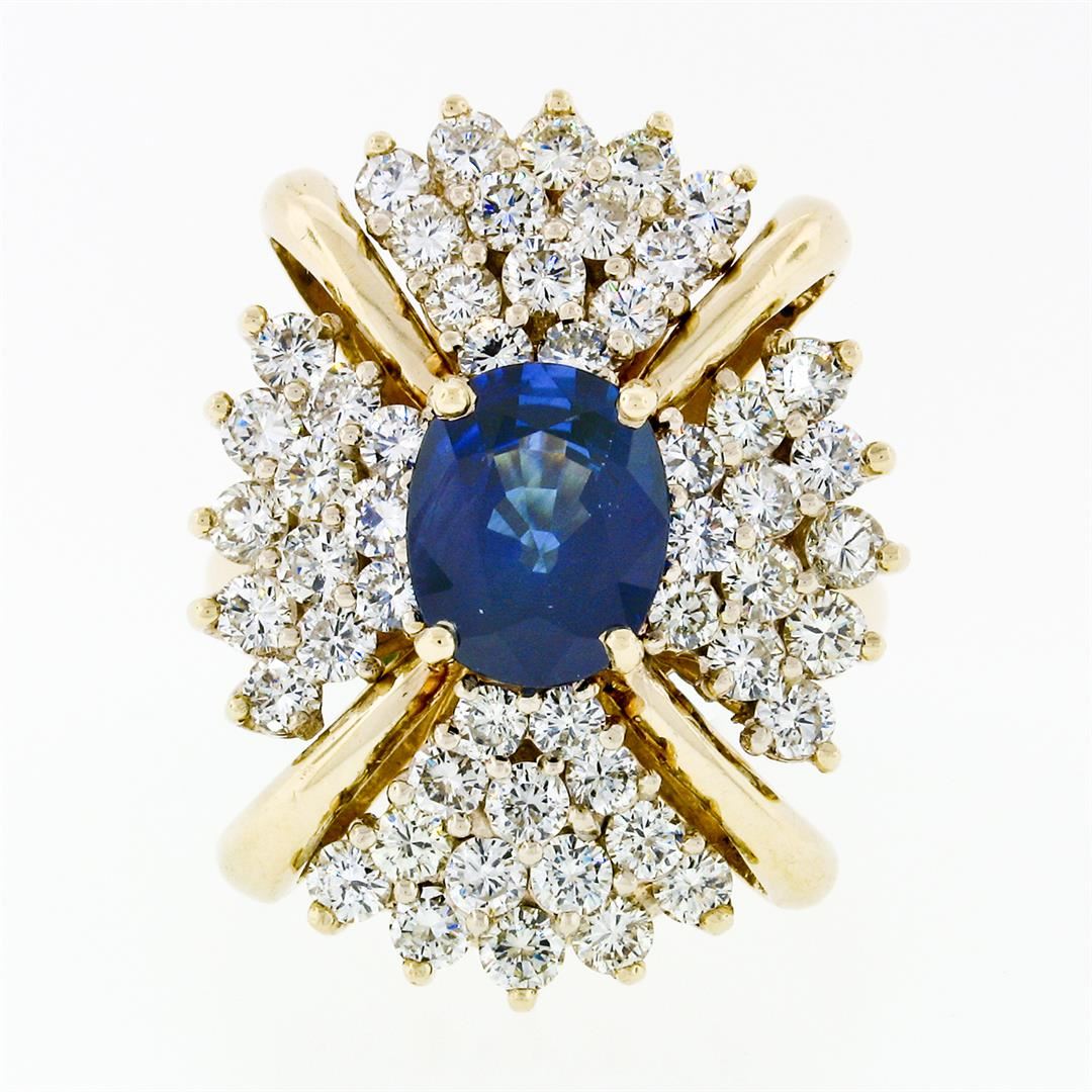 A vintage solid 14k yellow gold statement ring with a GIA certified oval ceylon sapphire (3.18ct) and 52 natural diamonds (I/J - VS1/VS2; 3.06ctw). The ring is size 9.0, weighs a total of 15.33 grams, and measures 28.77mm wide. Comes with all original relevant certifications.
