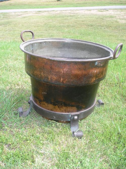 Large copper pot on heavy iron stand.