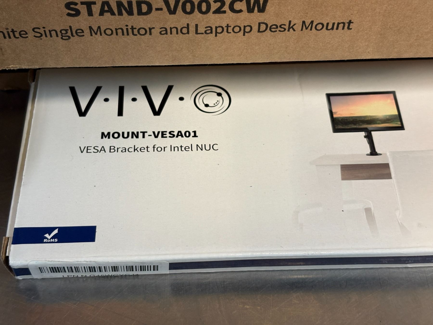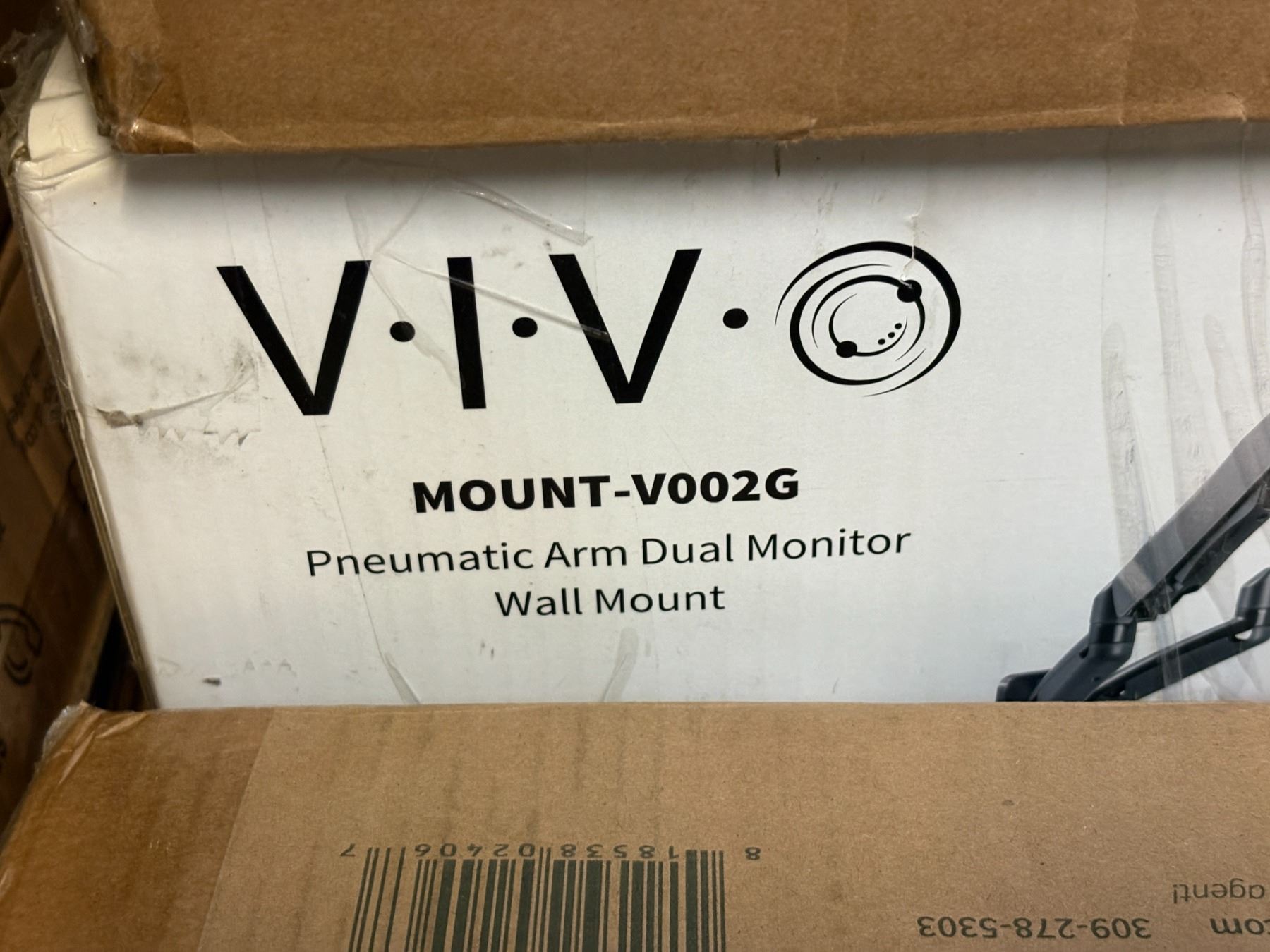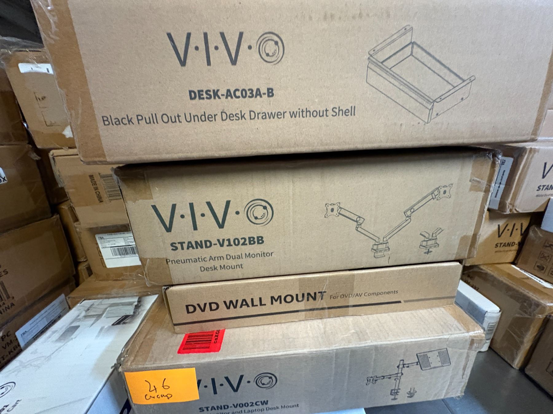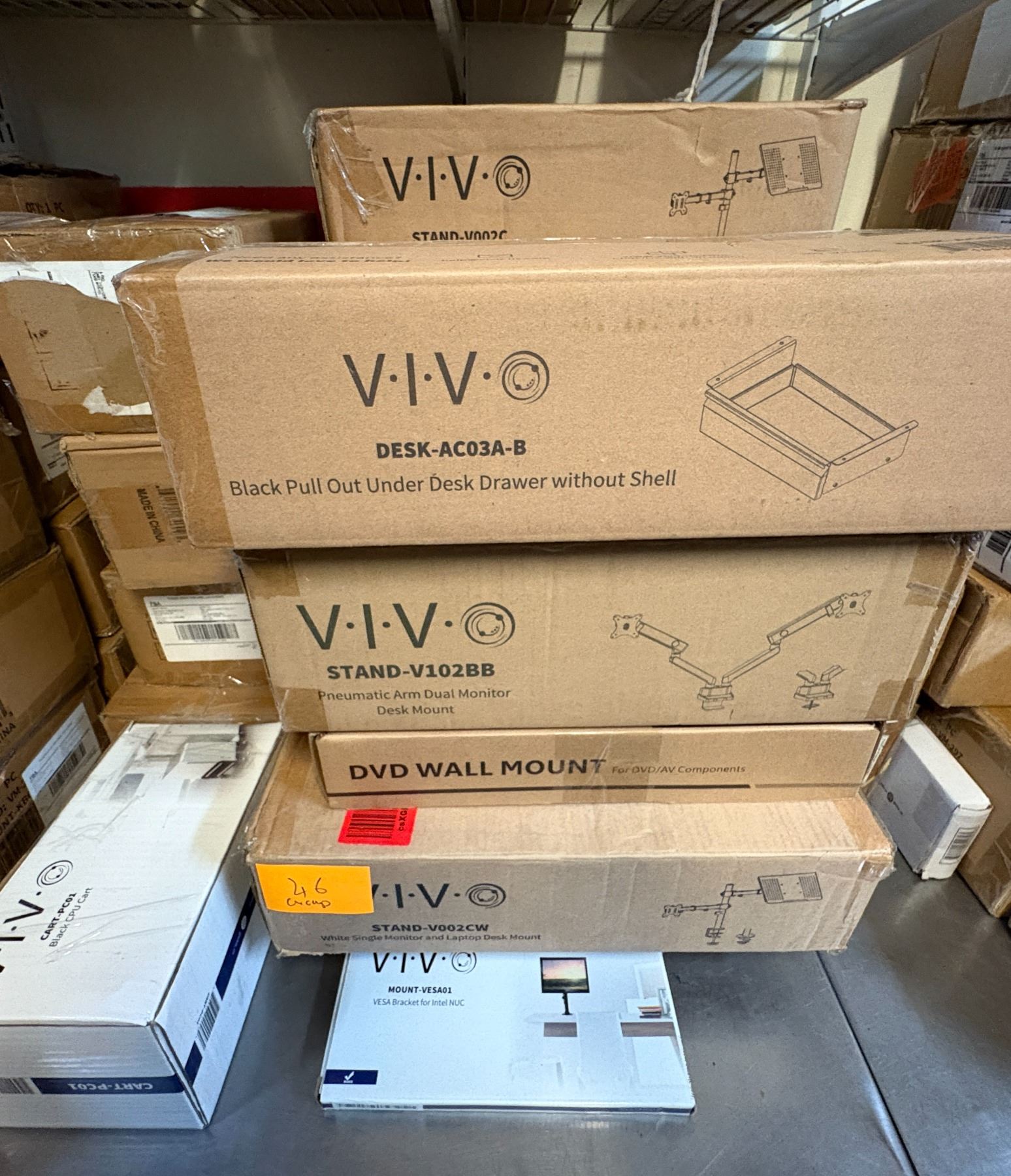 Large group of assorted VIVO monitor mounts & accessories - pneumatic arm, DVD wall mount, black CPU cart etc. (refurbished in boxes) approx. 15pcs