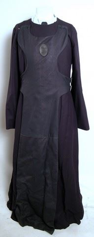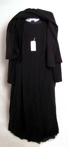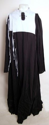 Bartok (Morgan Freeman) screen worn, hero, very heavy black wool with hood coat with snap buttons, black wool with leather front with emblem long coat, and light blue and black long linen snaps on the neck with ties dress. Includes wardrobe tag!