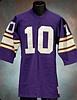 On the left front tail of the jersey is the "Medalist Sand-Knit Minnesota Vikings" manufacturer's tag. Below that is an additional "Medalist Sand-Knit" tag with the jersey size "LARGE". On the front, back and on each sleeve of the jersey is the player number "10" screen printed in white. The name plate on the back of the jersey has been removed, the outline remains. The jersey shows game-use and besides having the name plate removed appears to have no other alterations of any kind.
