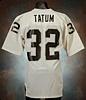 On the left front tail of the jersey is the "Sand-Knit" manufacturer's tag with the size "L" flag tag attached. Above that is the "Designed & Tailored Exclusively for Oakland Raiders" tag. On the front, back and both sleeves is the player number "32" in black on silver screened on lettering. Across the back is "TATUM" in black vinyl lettering on a white name plate. The jersey shows game-use and appears to have no alterations of any kind.