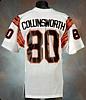 The left front tail of this jersey has the "CHAMPION" manufacturer's tag with jersey size "XL". On the front, back and both sleeves of this jersey is the player number "80" screened on in black on orange. Across the back of the jersey is the player name "COLLINSWORTH" screened on in black on a white name plate. Below the player numbers is the "CHAMPION" logo patch. The jersey shows light game-use and appears to have no alterations of any kind. An additional LOA will be provided.