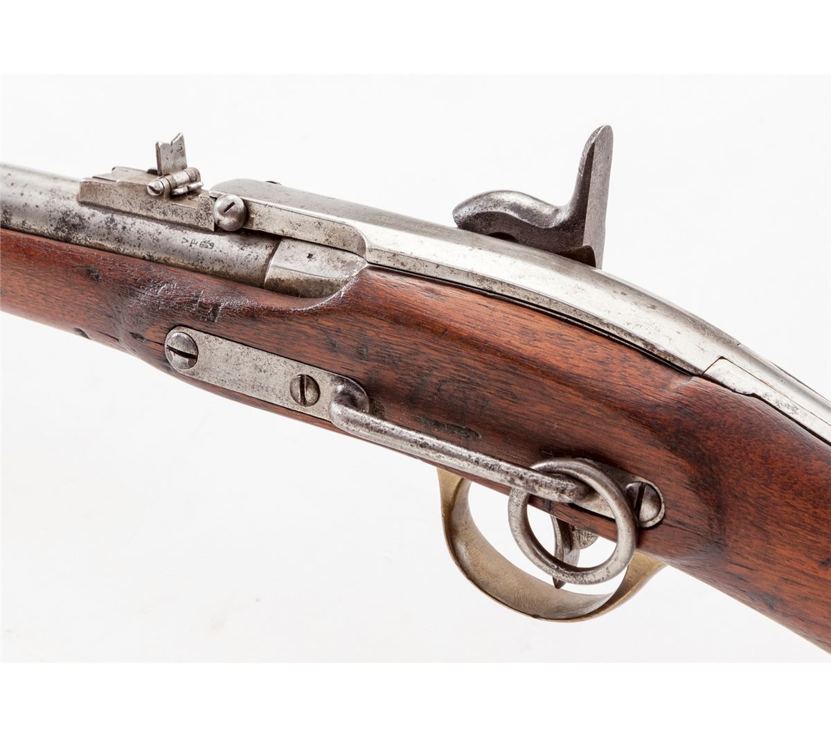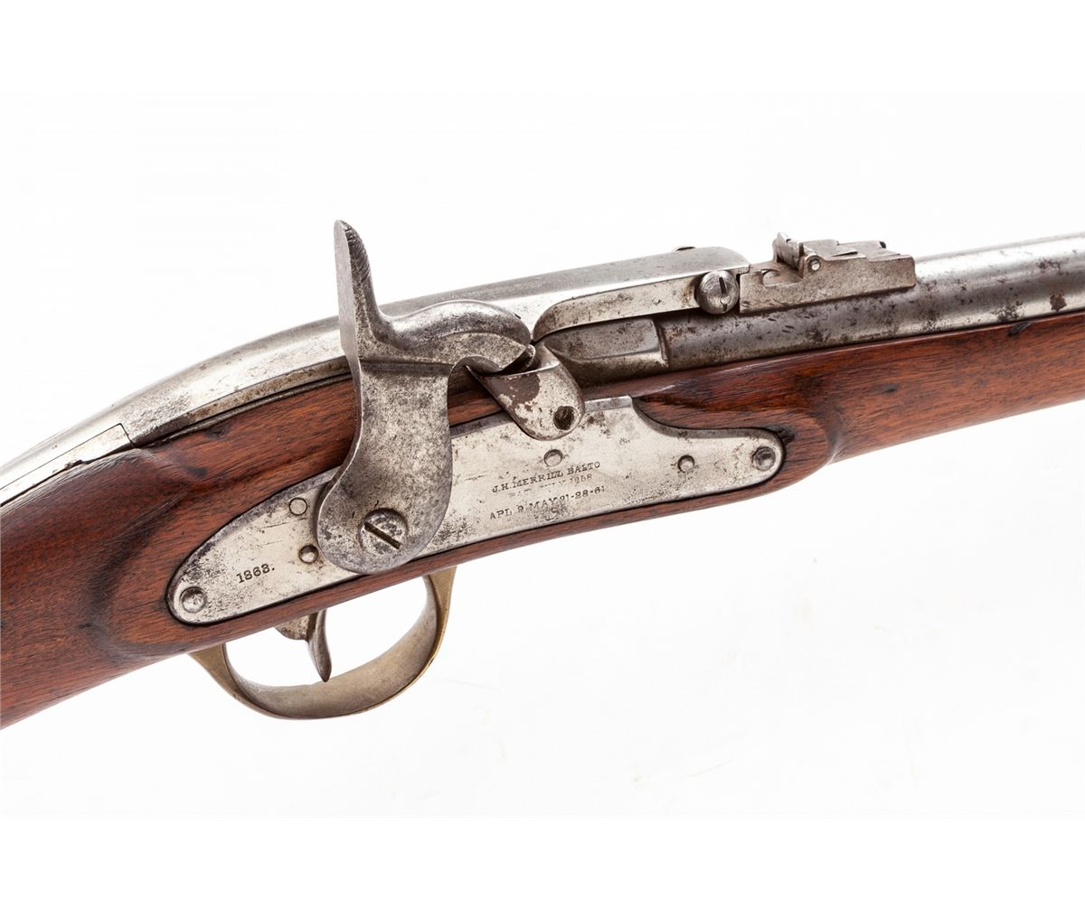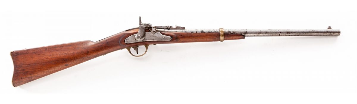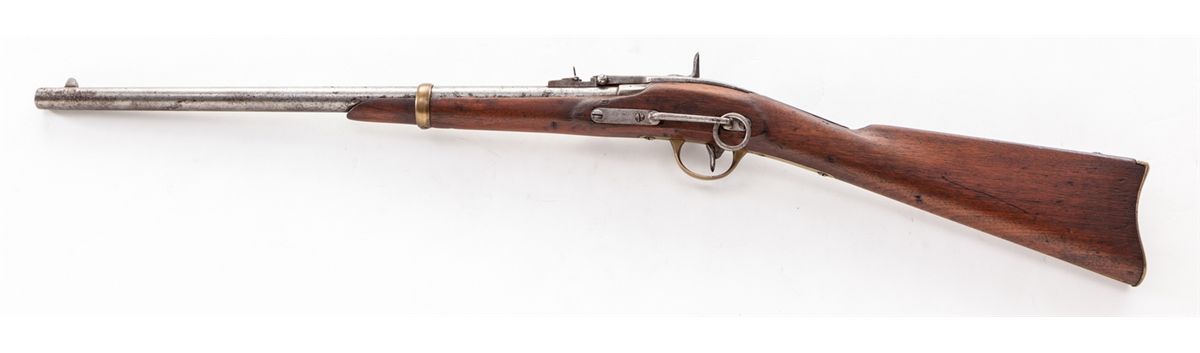 Late 1st Type Merrill Percussion Carbine, #13073, .54 cal., 22-1/8'' barrel with one brass band, buttplate, and triggerguard; originally with blue barrel, case hardened lock, breech, and breech lever; walnut stock. Condition is good to very good with moderate toning to barrel and silvering to case hardened components. Little original finish remains. Stock with light sanding. Action and bore are good. Est.: $800-$1,200. (Antique)