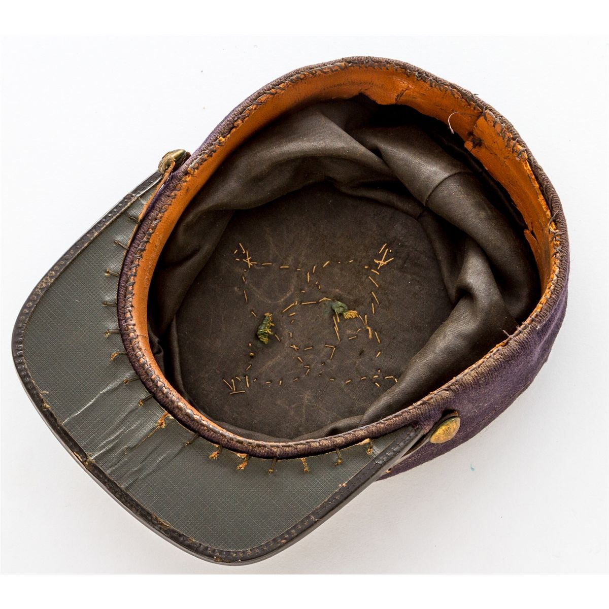 Late Civil War to Early Indian War Period Officer's Kepi, with 8th Cavalry Troop D crossed sabers at front, two-panel construction, tarred brim, and early eagle buttons. Condition is very good showing some repairs to stitching and re-attachment of sweatband. Black interior lining with minor soiling; exterior with small nip at top right portion. Est.: $800-$1,200.