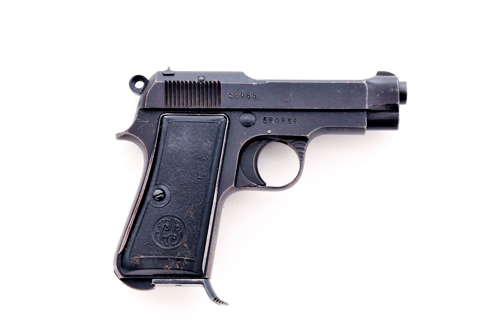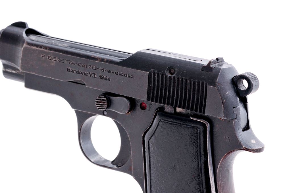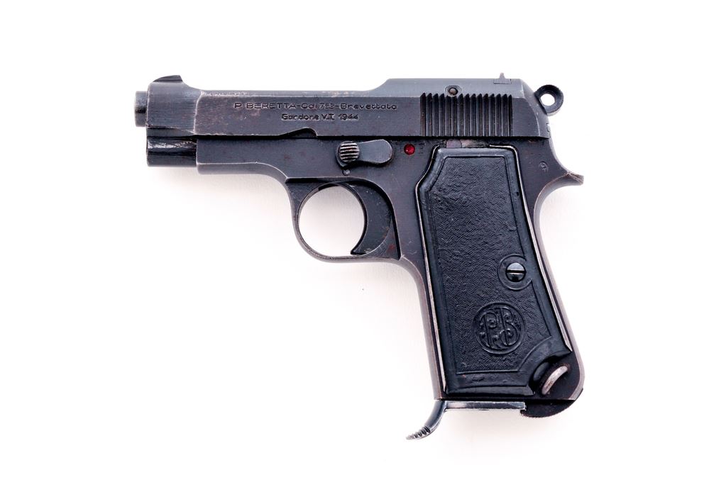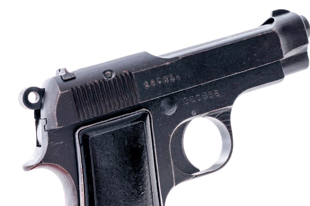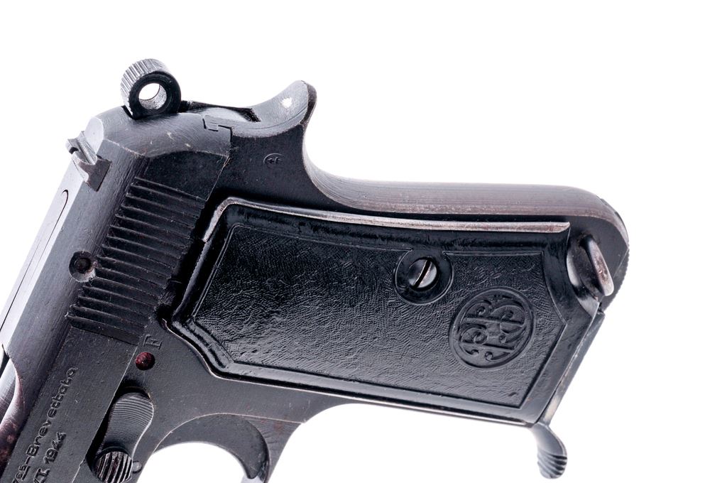 Late War Beretta Model 1935 Semi-Automatic Pistol, #580856, .32 ACP cal., 3.5'' barrel, matte wartime finish, black hard rubber grip panels with ''PB'' logos, and one factory magazine. Dated 1944. Condition is near excellent, appearing near new, with approx. 95% lightly thinning finish. Nice action, bright bore. Est.: $450-$650. (C&R/PPT)