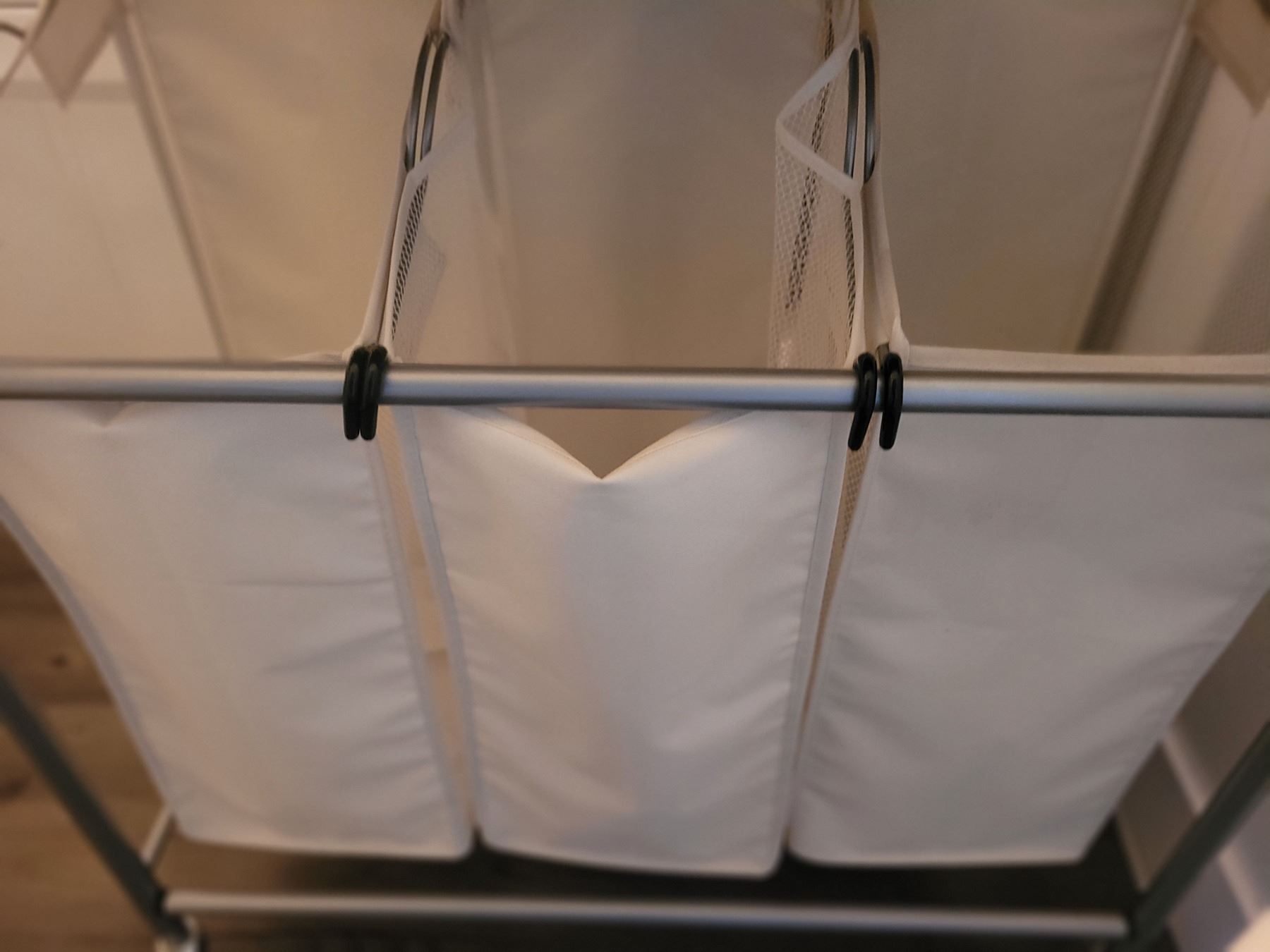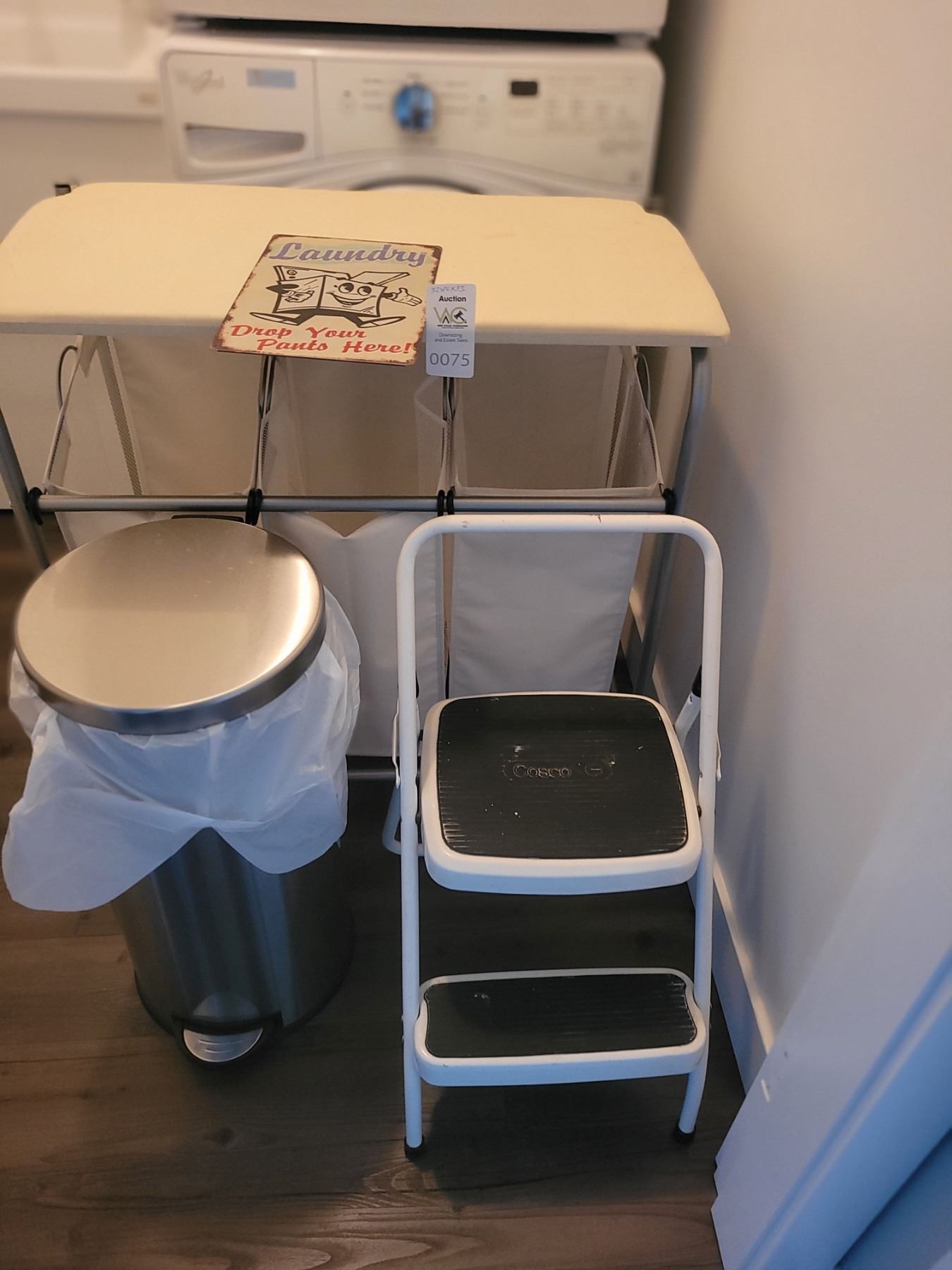 Metal tri bin laundry hamper. Step stool and garbage container. Pickup at 10 am