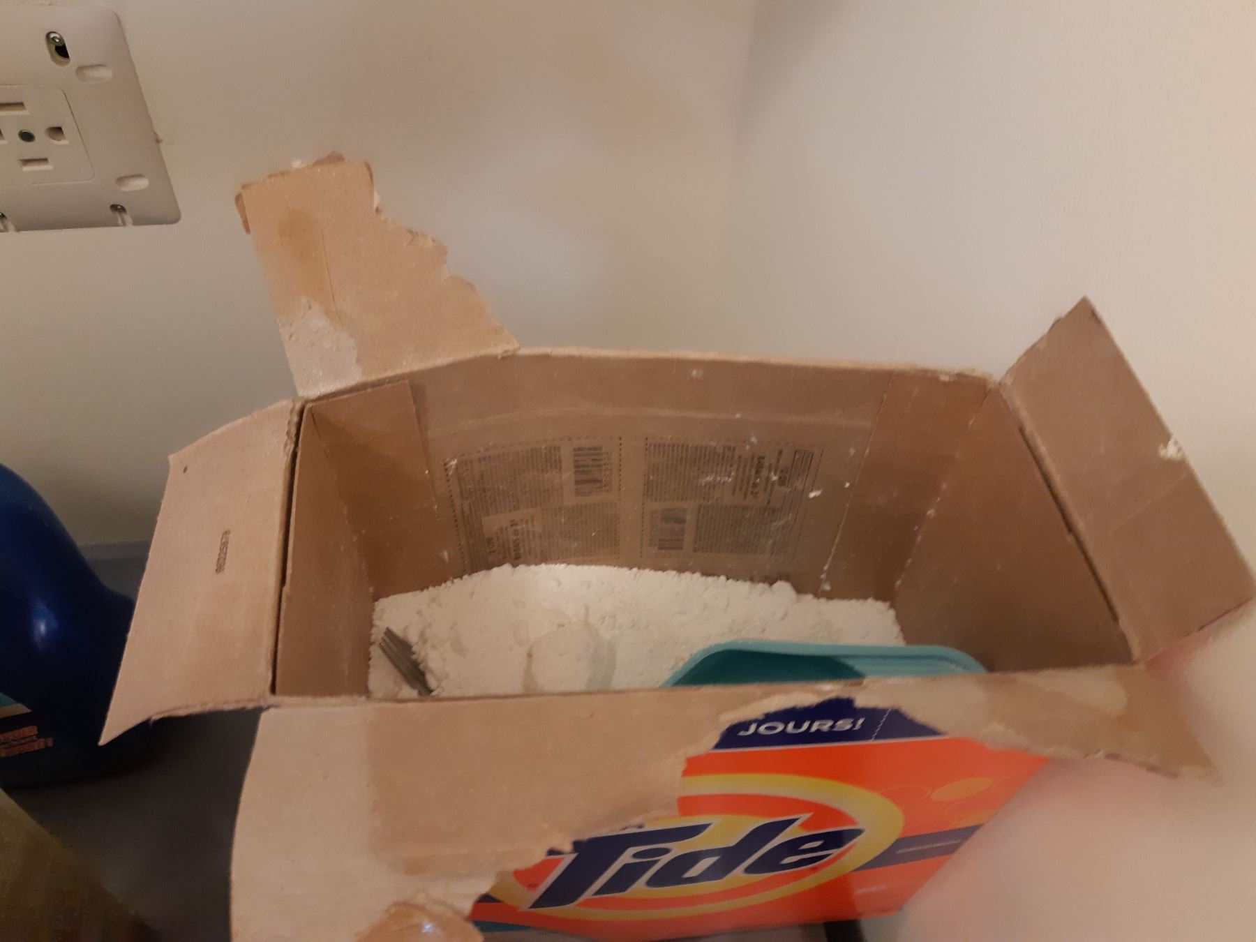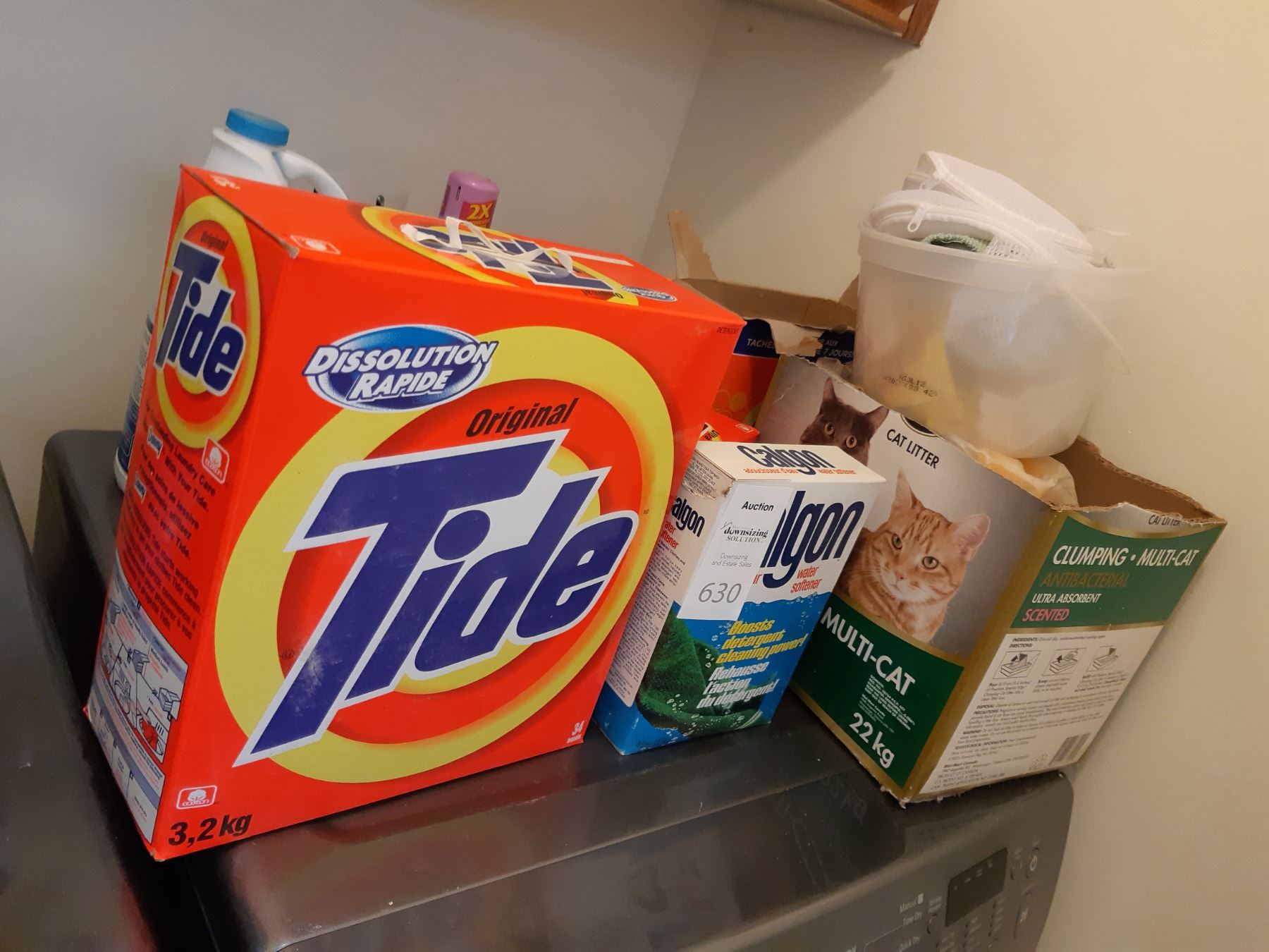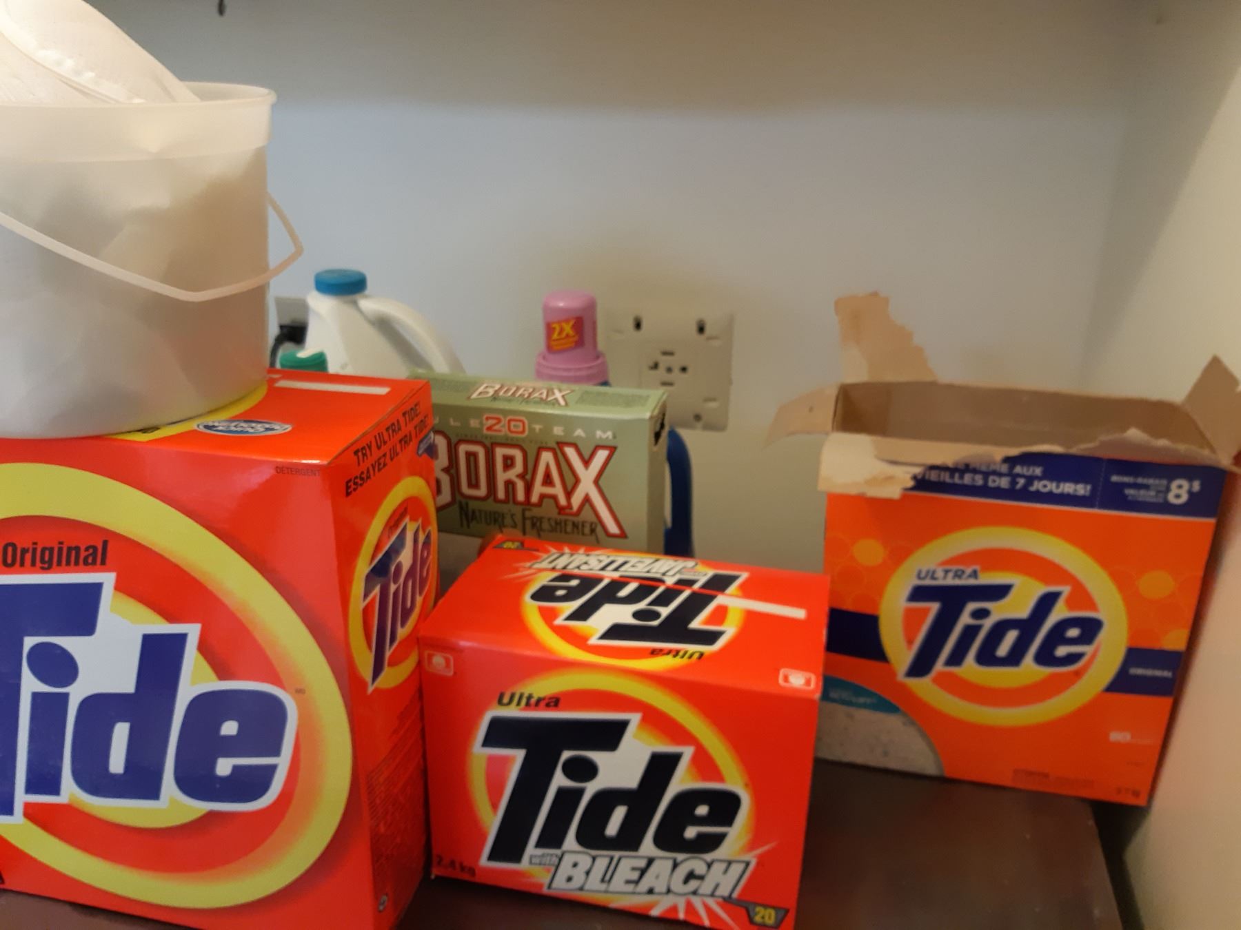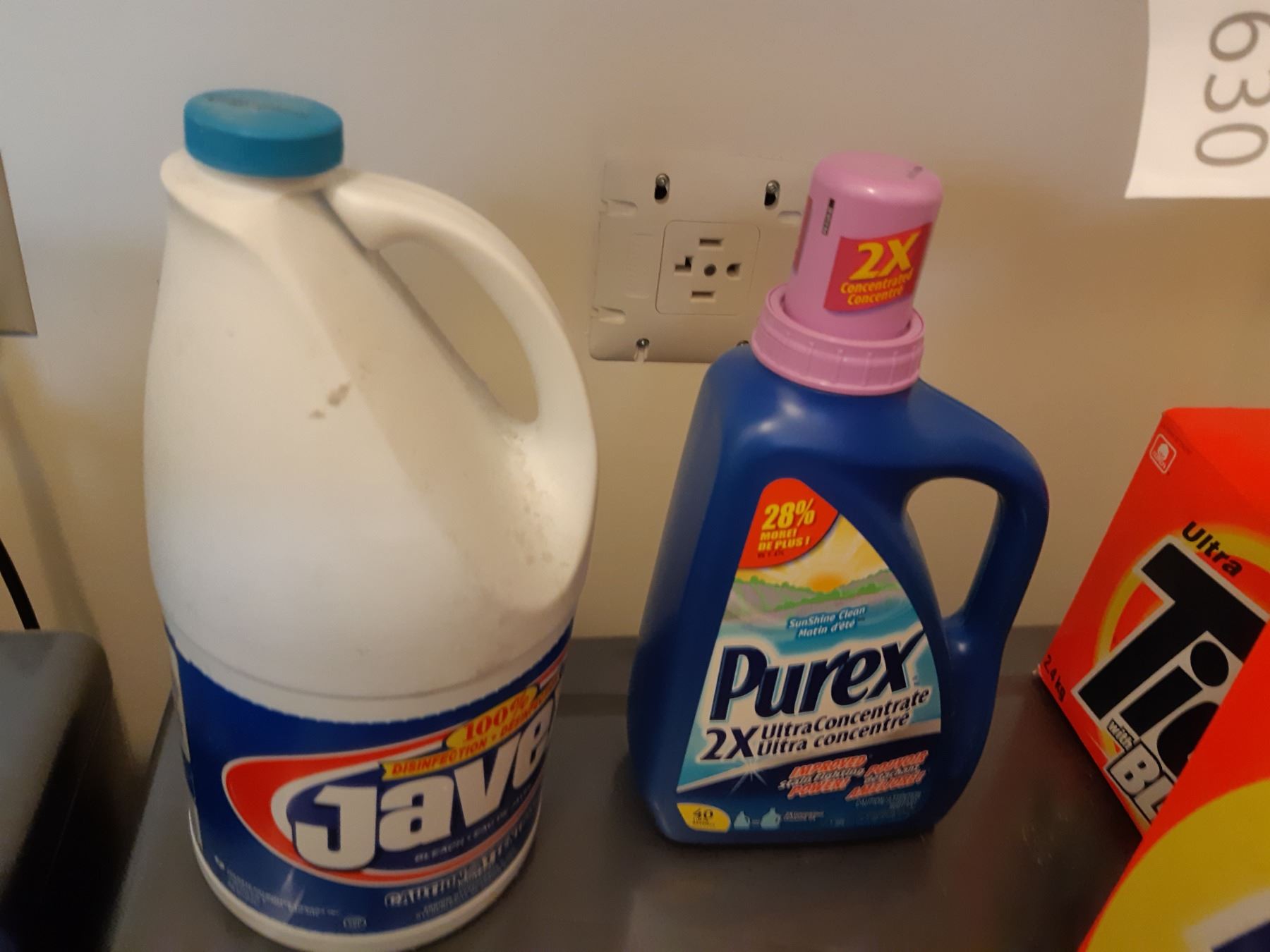 Laundry soap, bleach, scrubbers. Pick up at 10:30