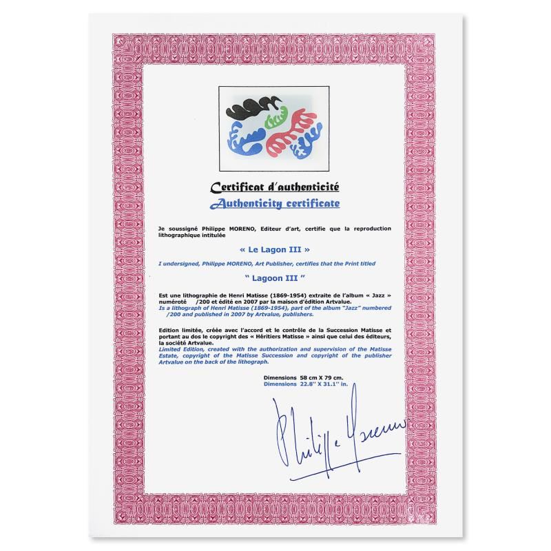 Le Lagon III (Lagoon III) is a limited edition lithograph by Henri Matisse (1869-1954). This piece comes from an edition of 200 authorized by the Matisse Estate; the edition number is not on the piece itself but on the certificate. This piece comes custom framed. Includes Certificate of Authenticity. Measures approx. 37 x 29 (frame), 31 x 23 (image).
