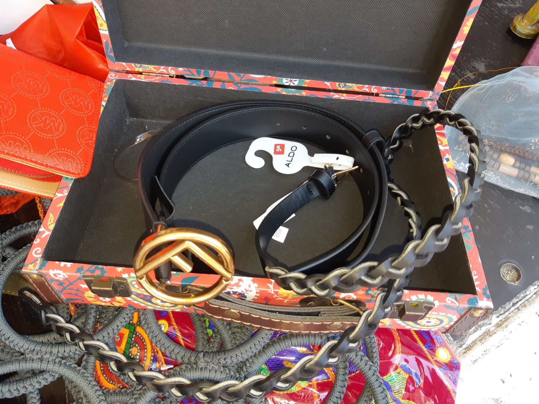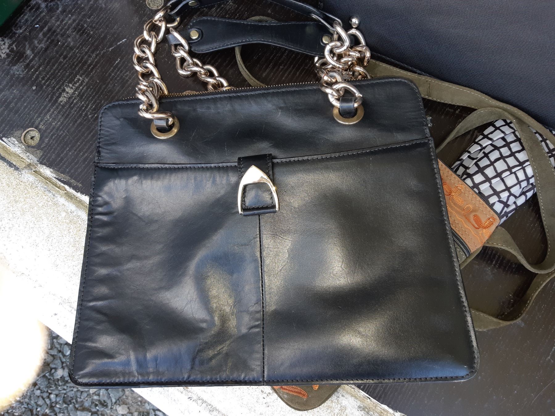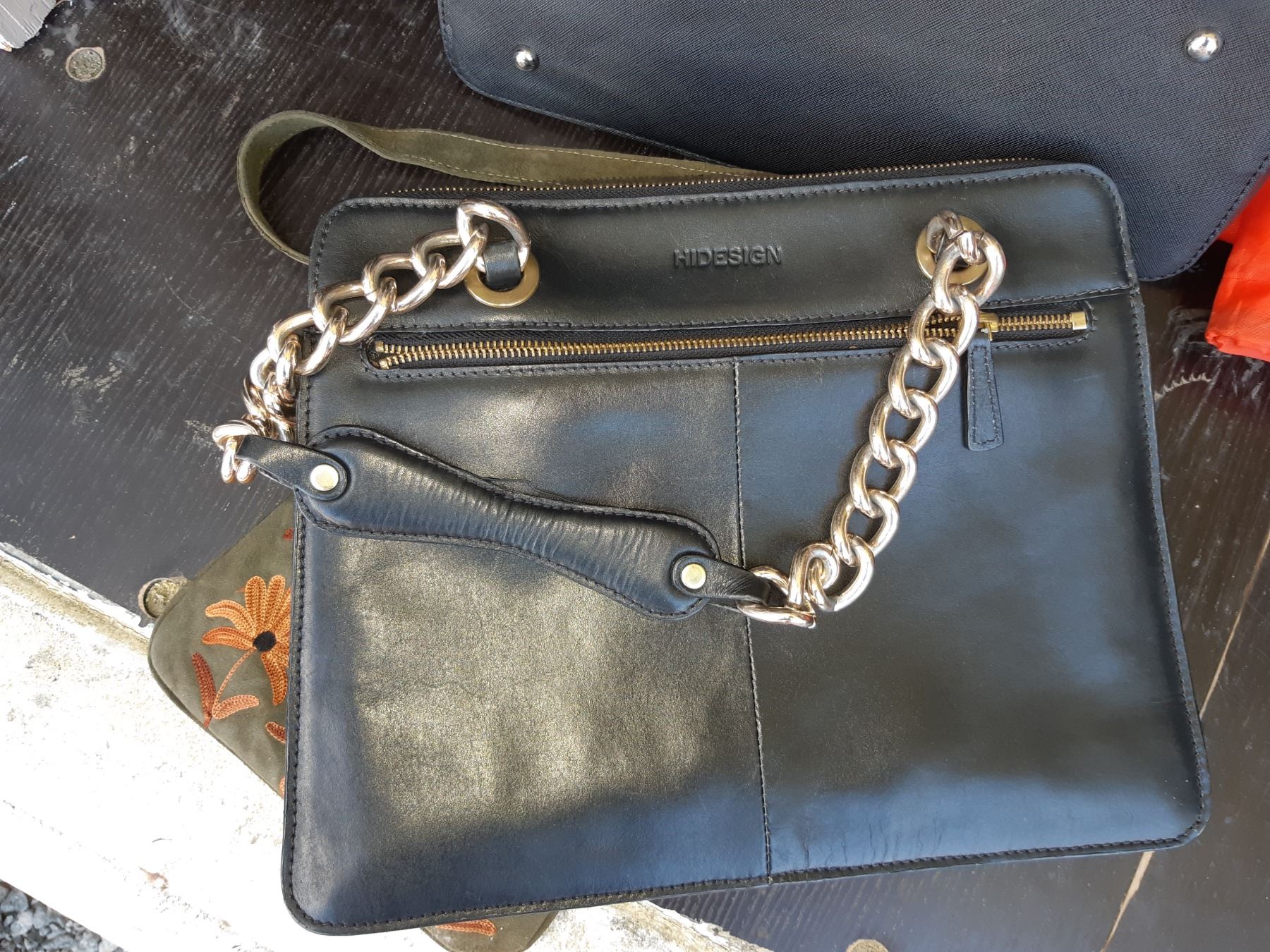 Black Leather Hidesign Handbag, Cors purse, David Jones handbag, Aldo handbag, costume jewelry and Scraf Hangers. Pickup at 10 am