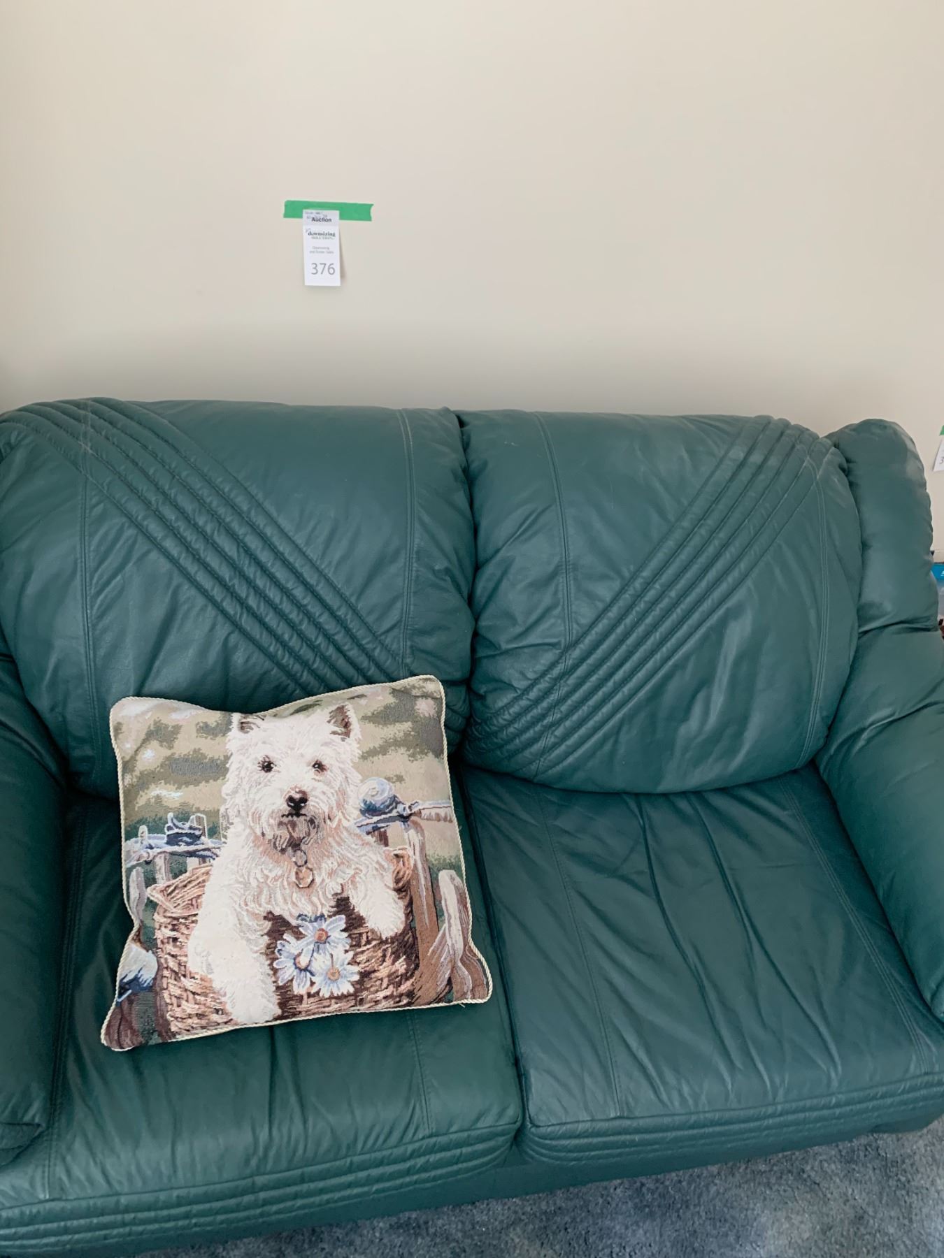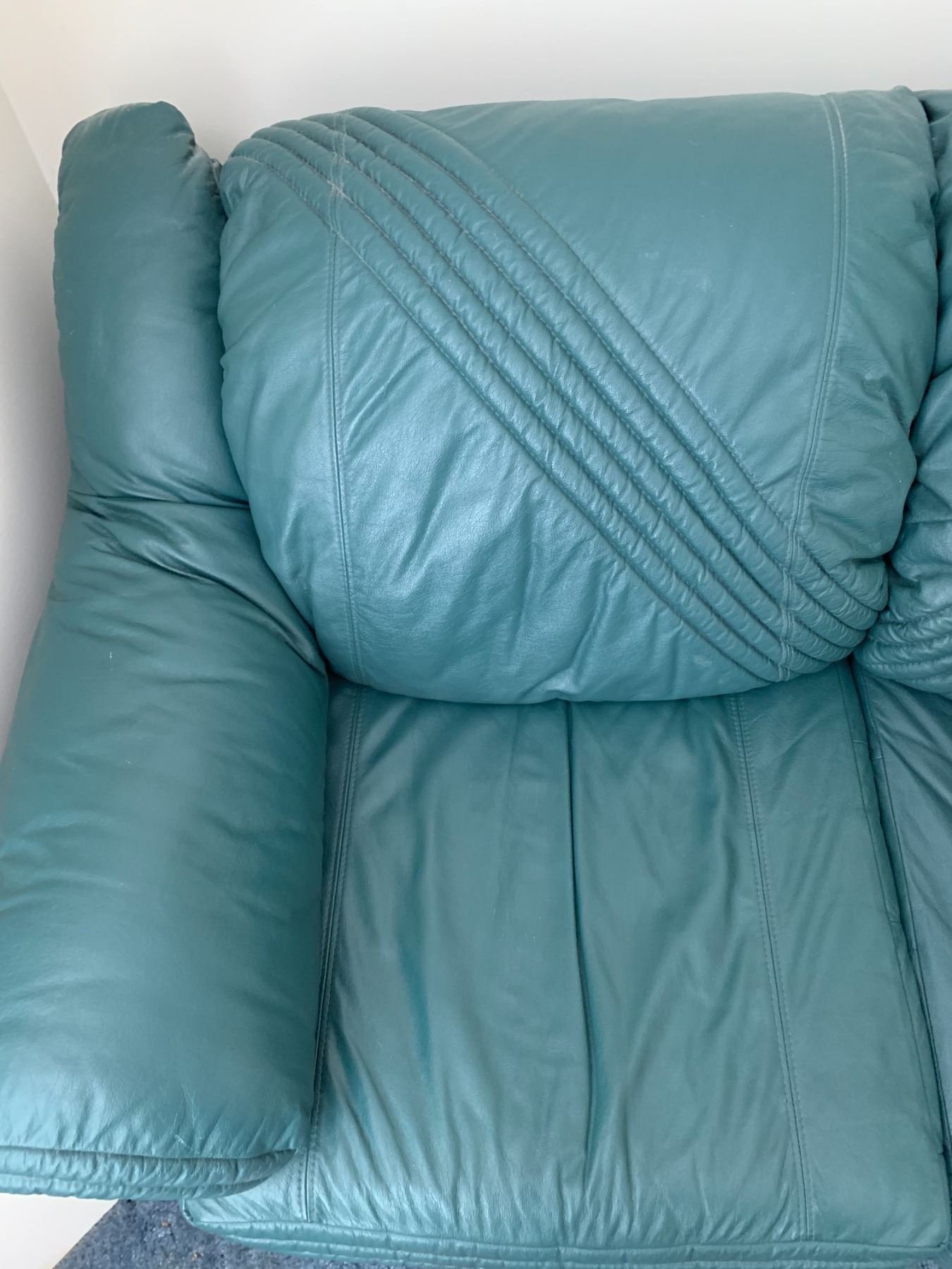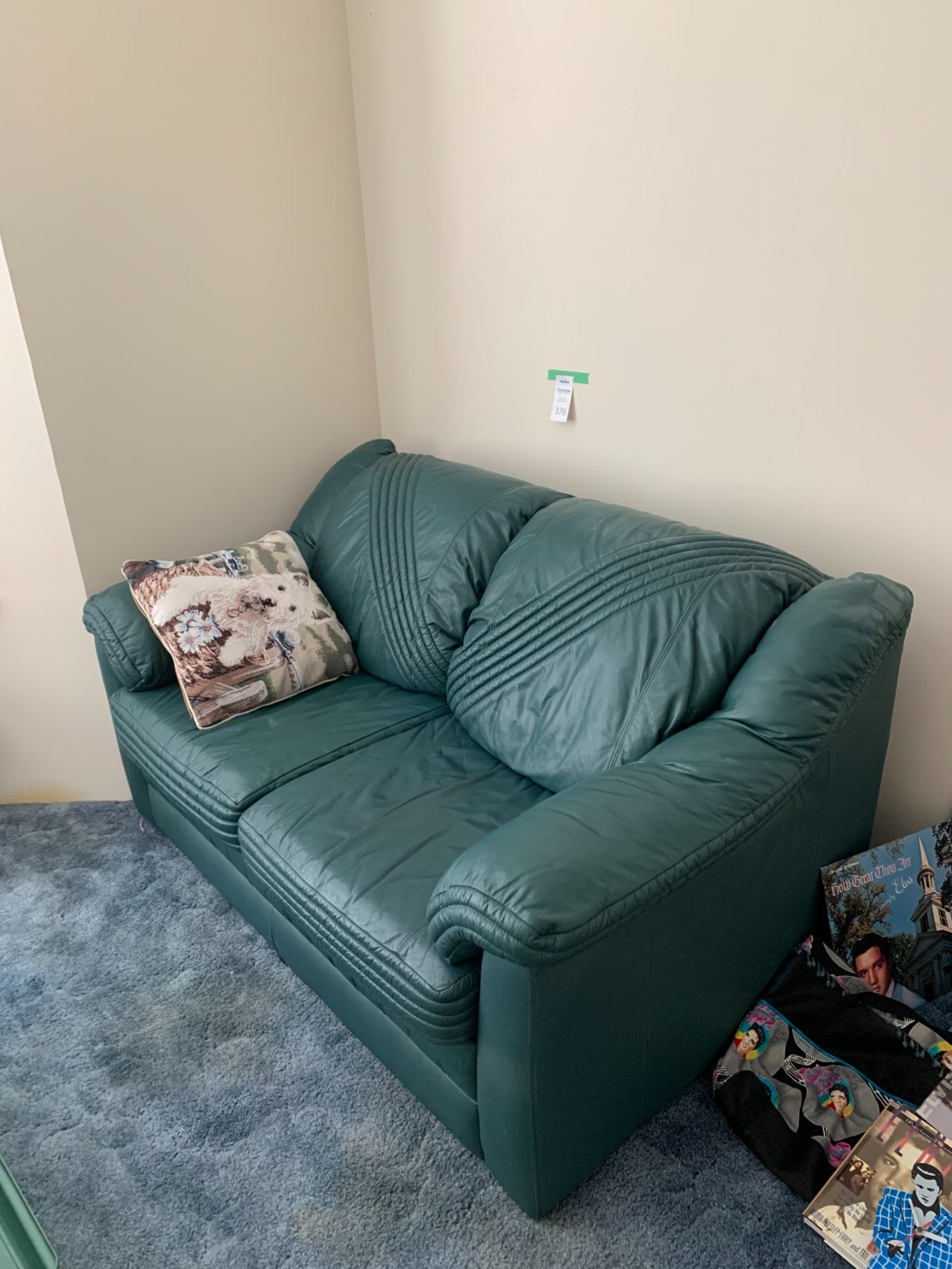 Green leather love seat 63x36x34 detailed stitching . Bring help to remove down stairs and pickup at 11 am