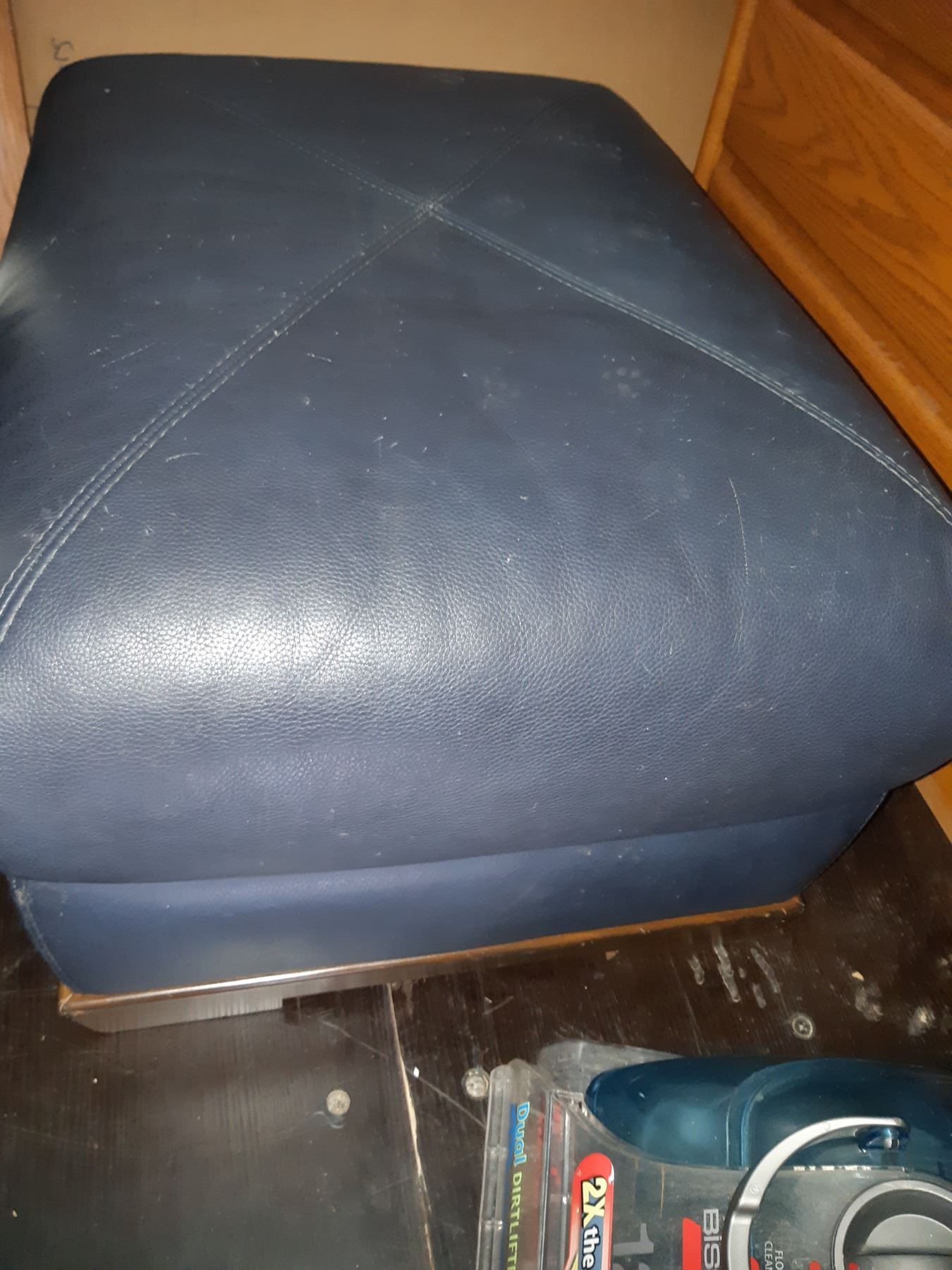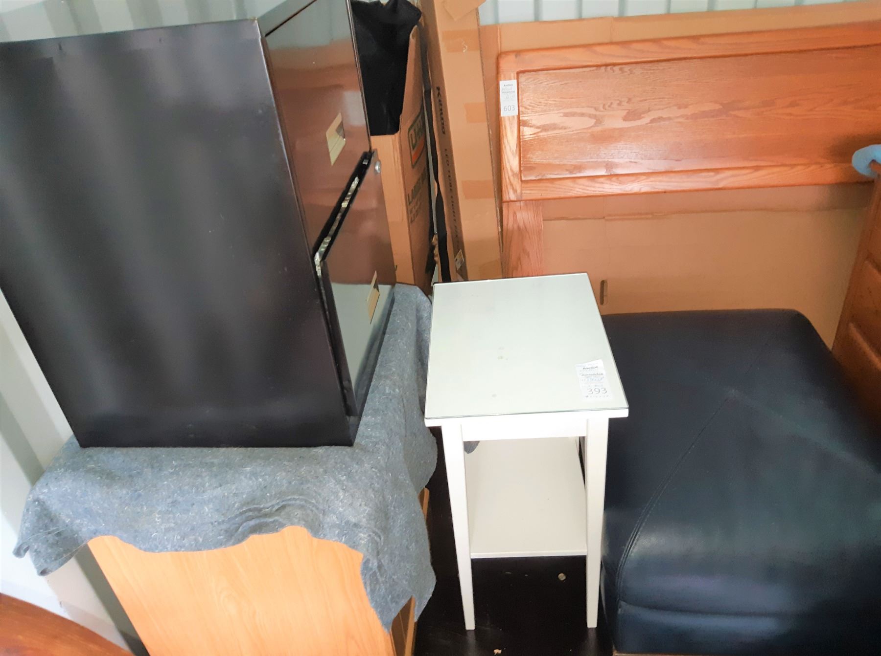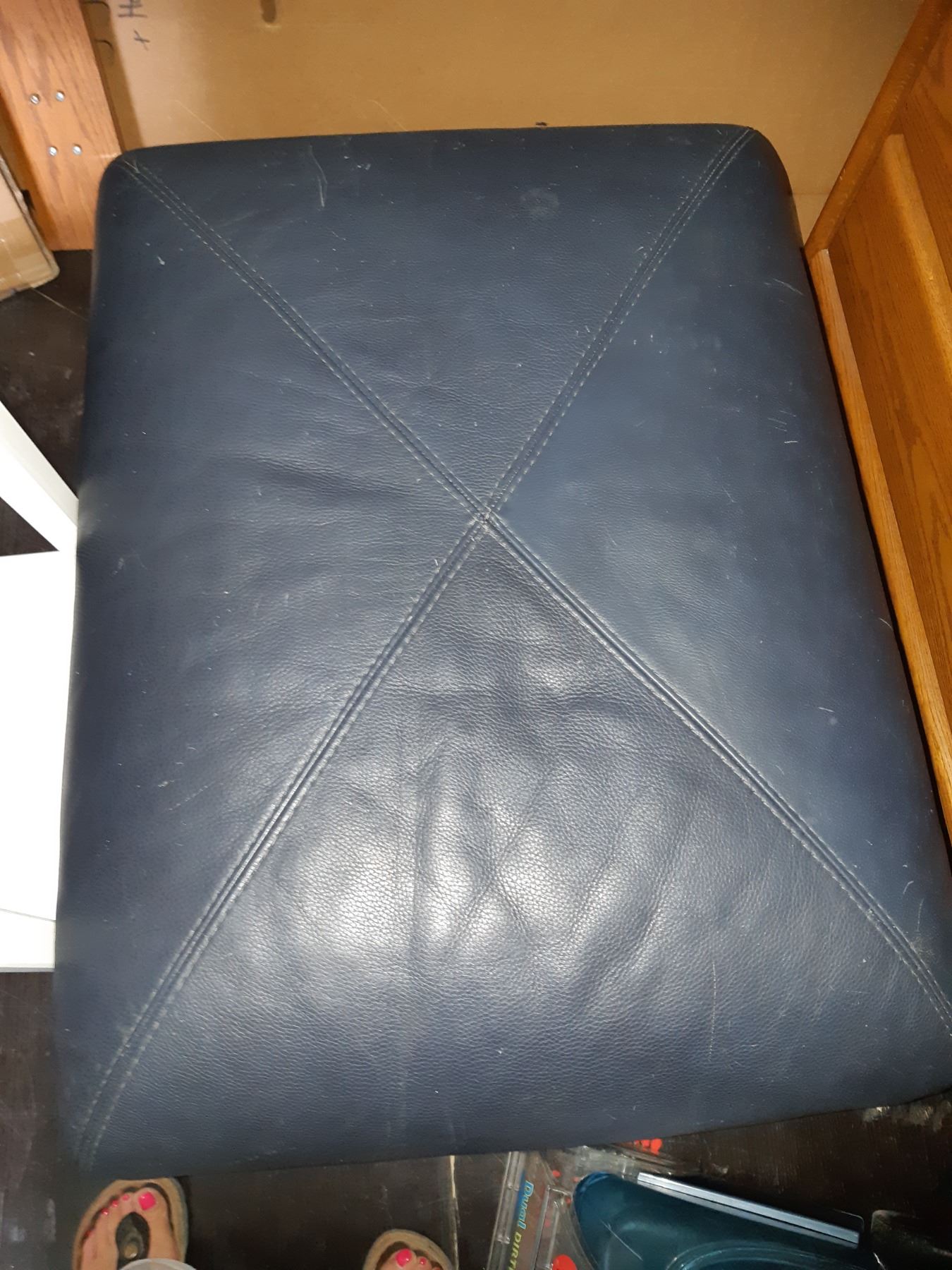 Blue Leather Ottoman 35x27x15. White end table with shelf below and glass cover on top, 18x14x28. Black 2 drawer file cabinet 17x18x24. Pickup at 11 am
