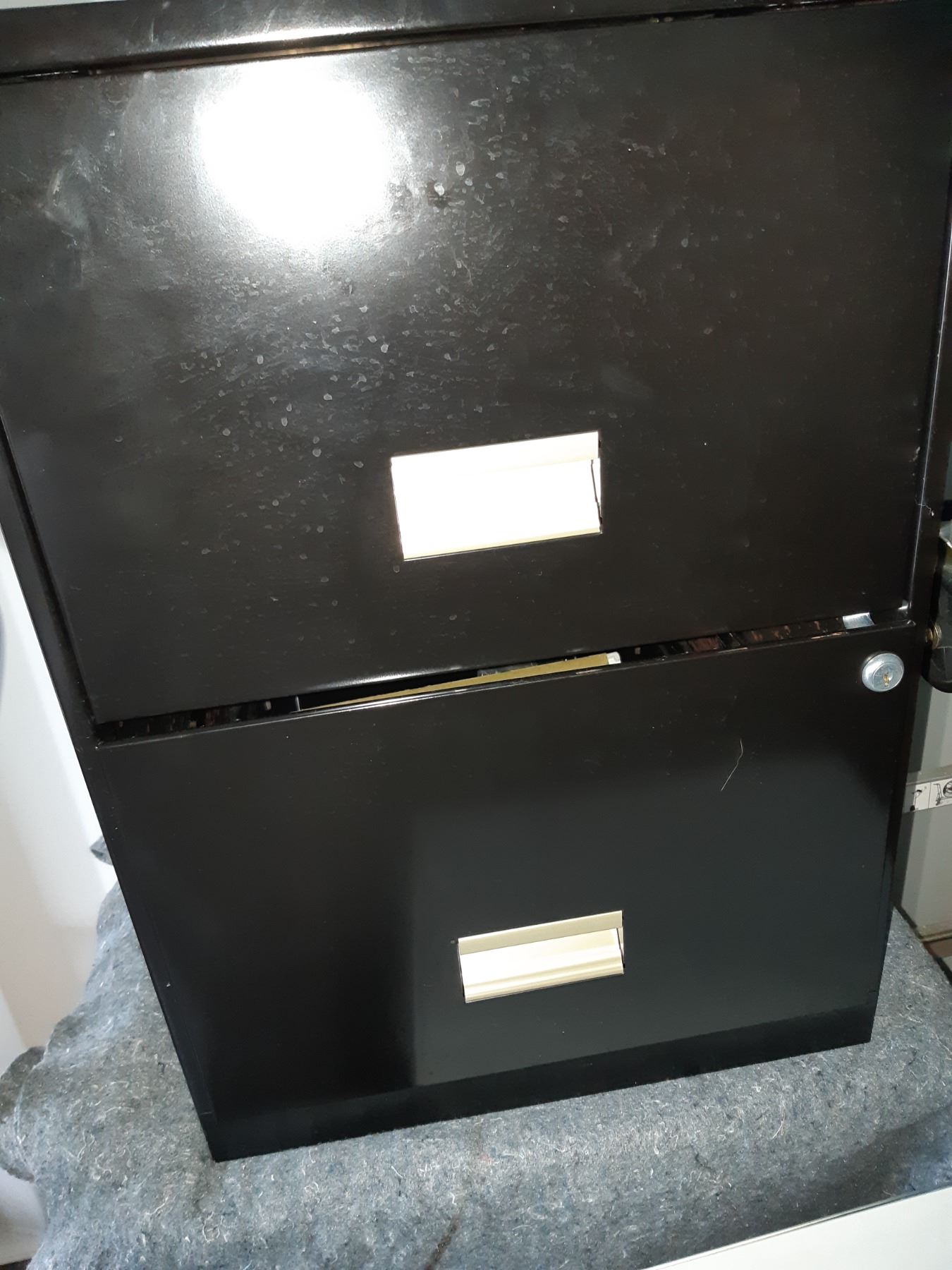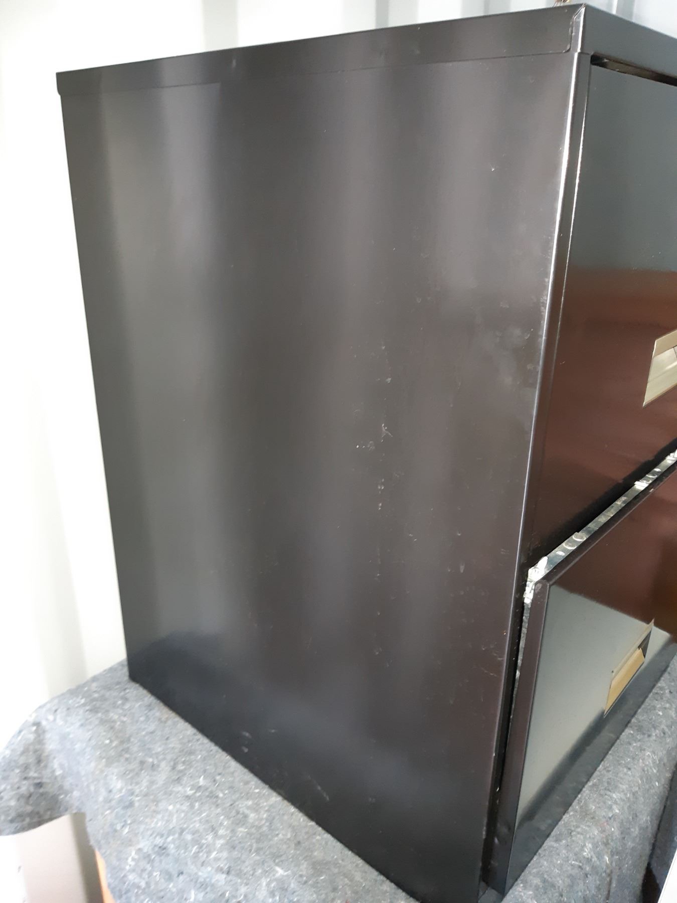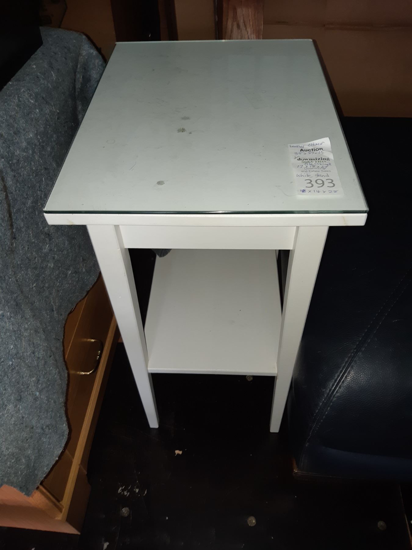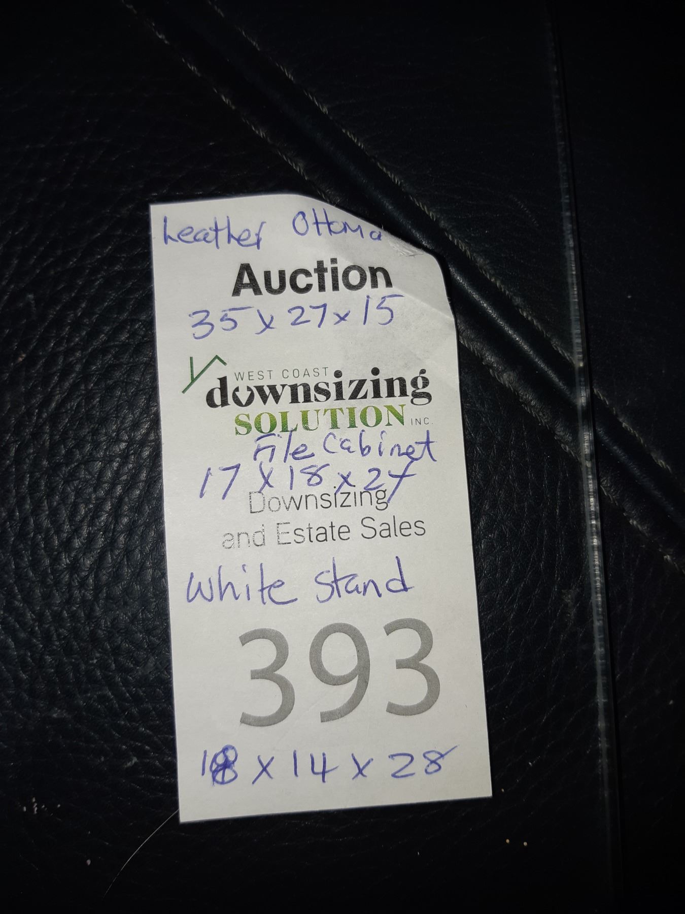 Blue Leather Ottoman 35x27x15. White end table with shelf below and glass cover on top, 18x14x28. Black 2 drawer file cabinet 17x18x24. Pickup at 11 am