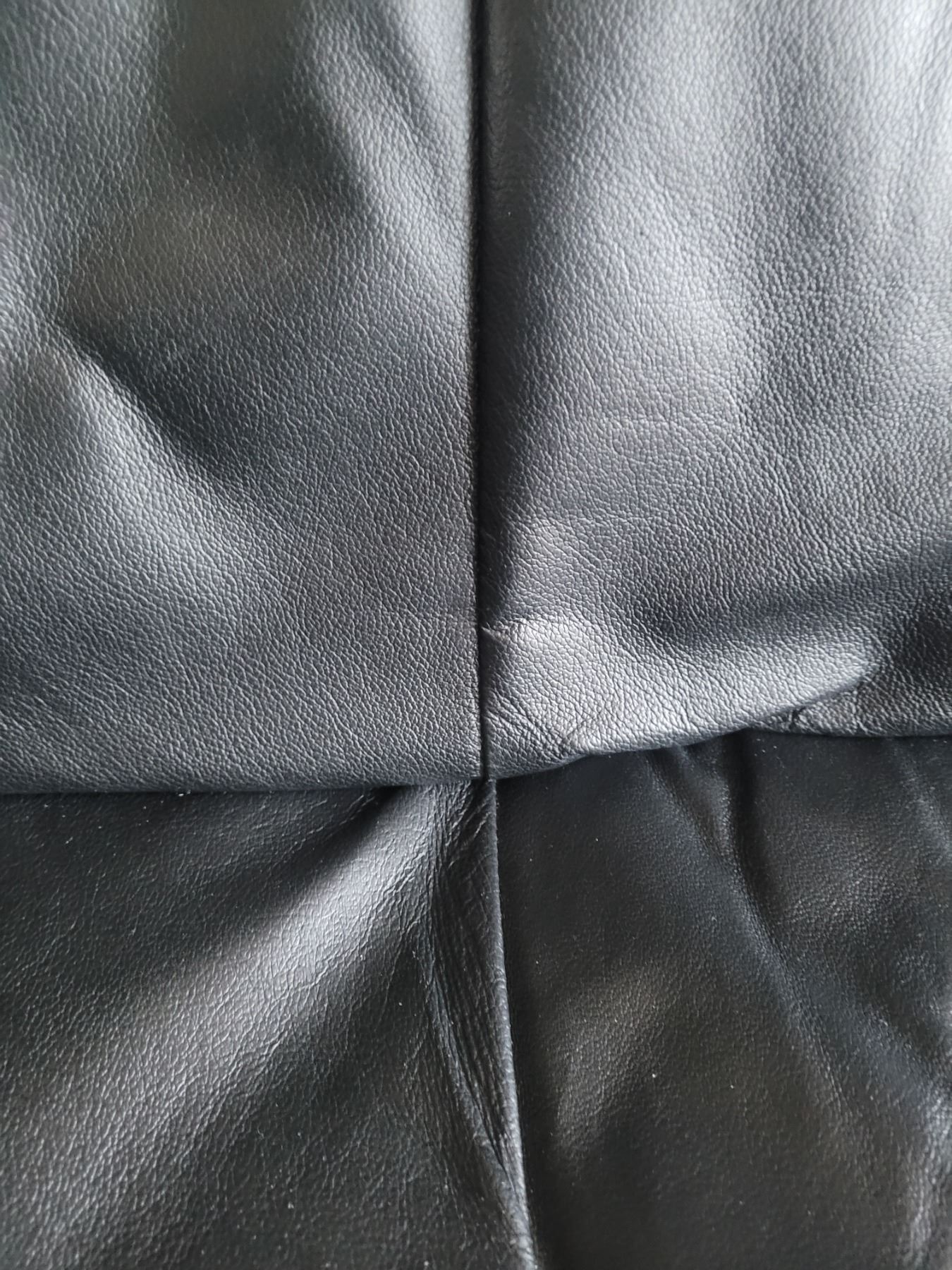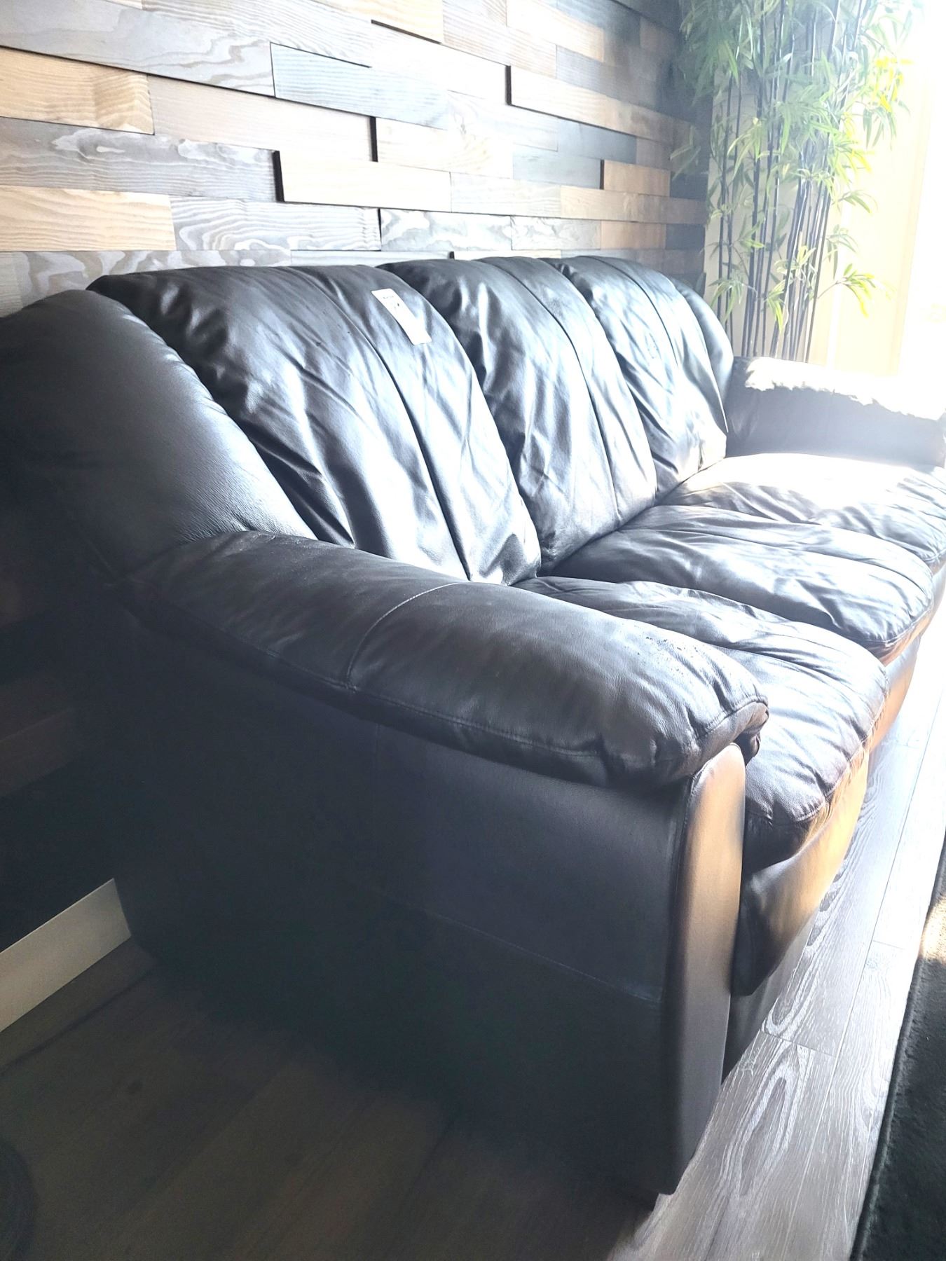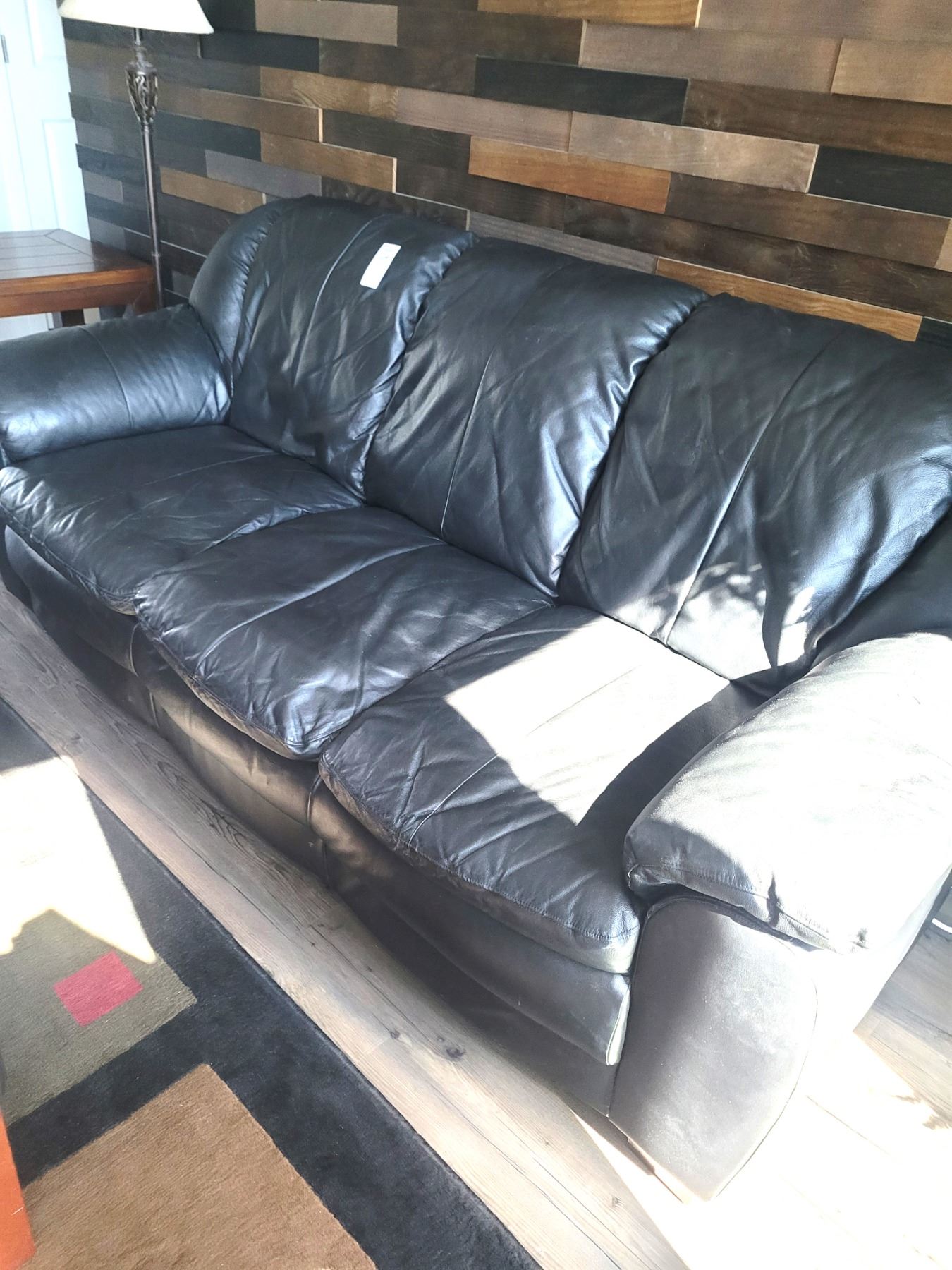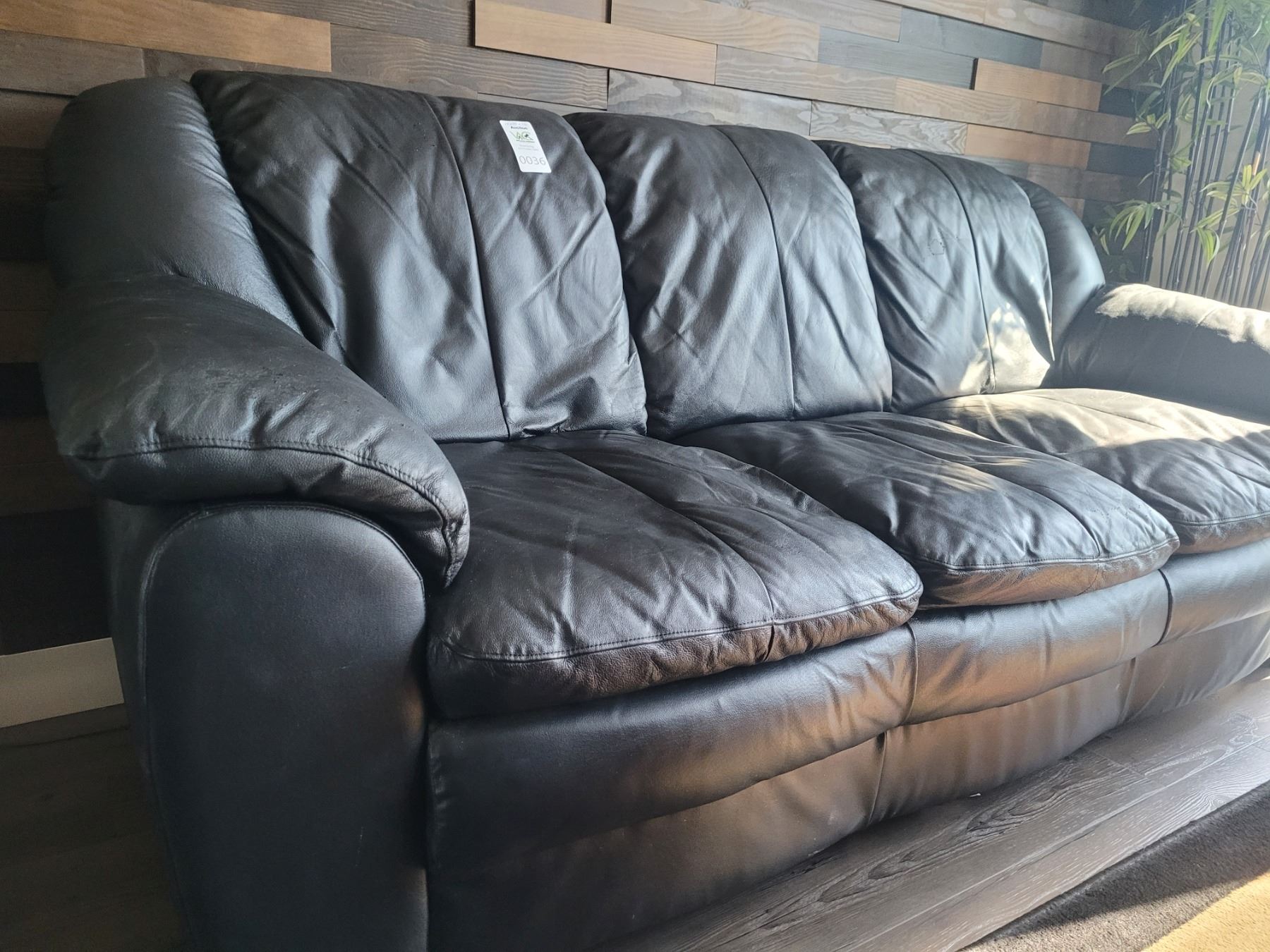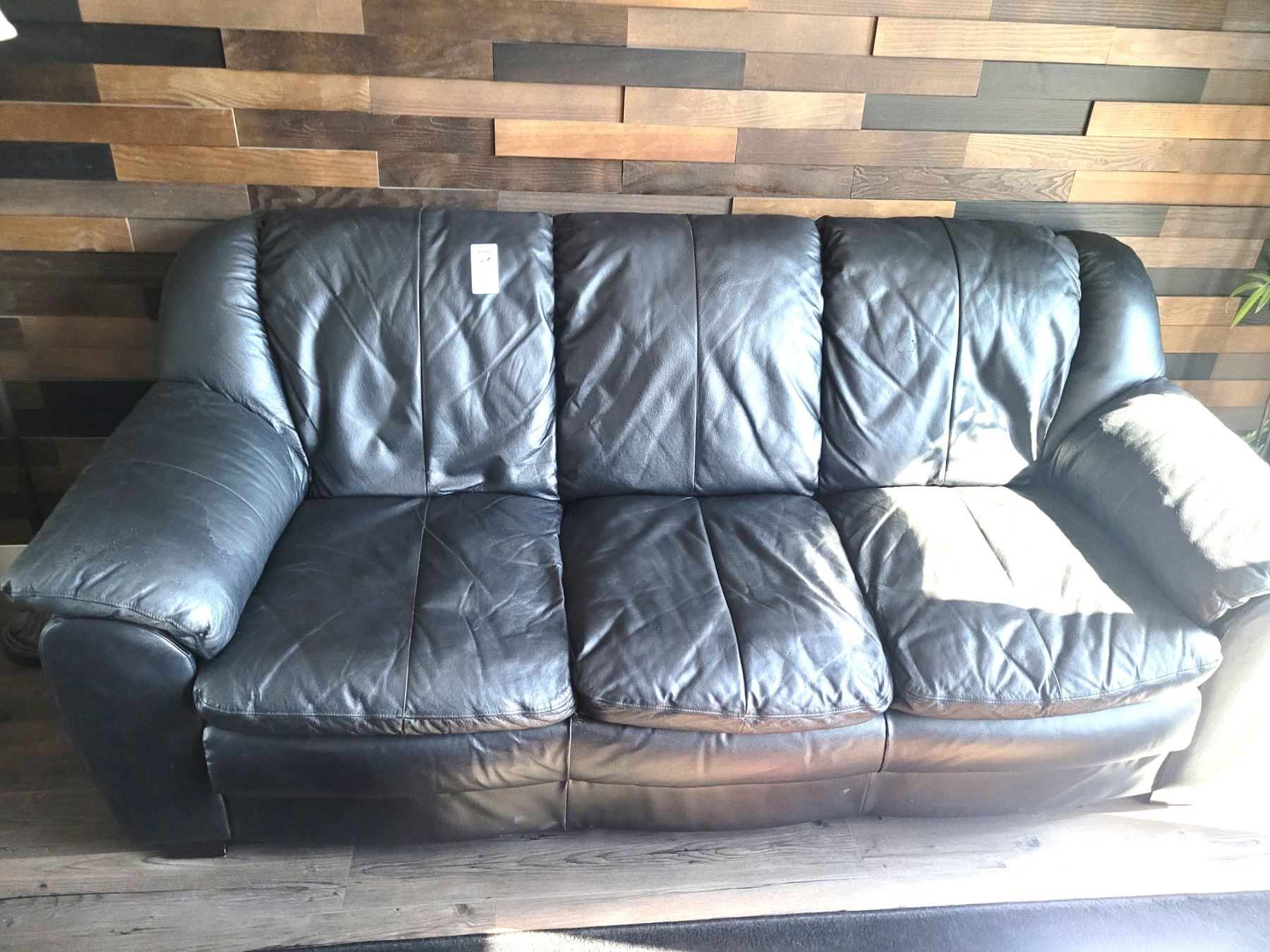 Black leather 3 seater sofa. 78x36x36 Stairs pickup at 11 am