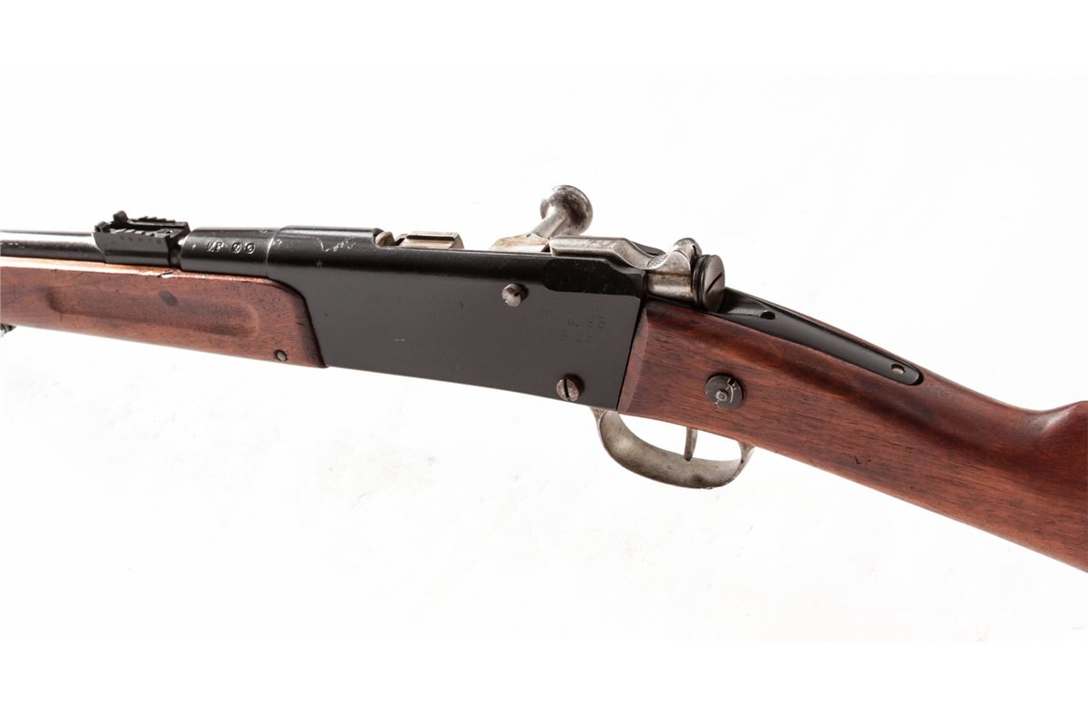 Lebel Model 1886/M93/R35 Bolt Action Carbine, by St. Etienne, #K56550, 8mm Lebel cal., 19'' barrel, stove black finish, walnut stock and handguard. Condition is good retaining approx. 92% arsenal black. Stock with light scuffs. Missing forend cap and two band retainers. Rear band has been cleaned bright with non-original band screw. Action is crisp, bore is very good. Est.: $150-$300. (Antique)