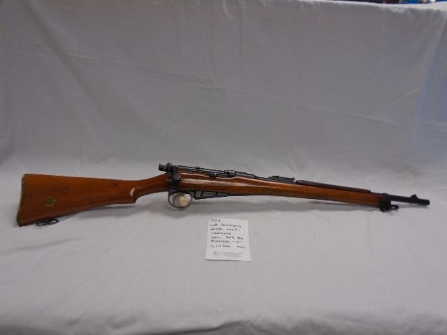 Stock 77R-508 G1, LEE ENFIELD, Model MK #1 Carbine, Caliber .303BR, Bolt Action Rifle, Barrel Length 21” Has Clip and Mag cutout ,Sling Swivels. Military Iron Sights, Dust Cover, Armoury repaired wood at the bayonet lug, Excellent bore, Condition 8/10, SN. 4XXX,