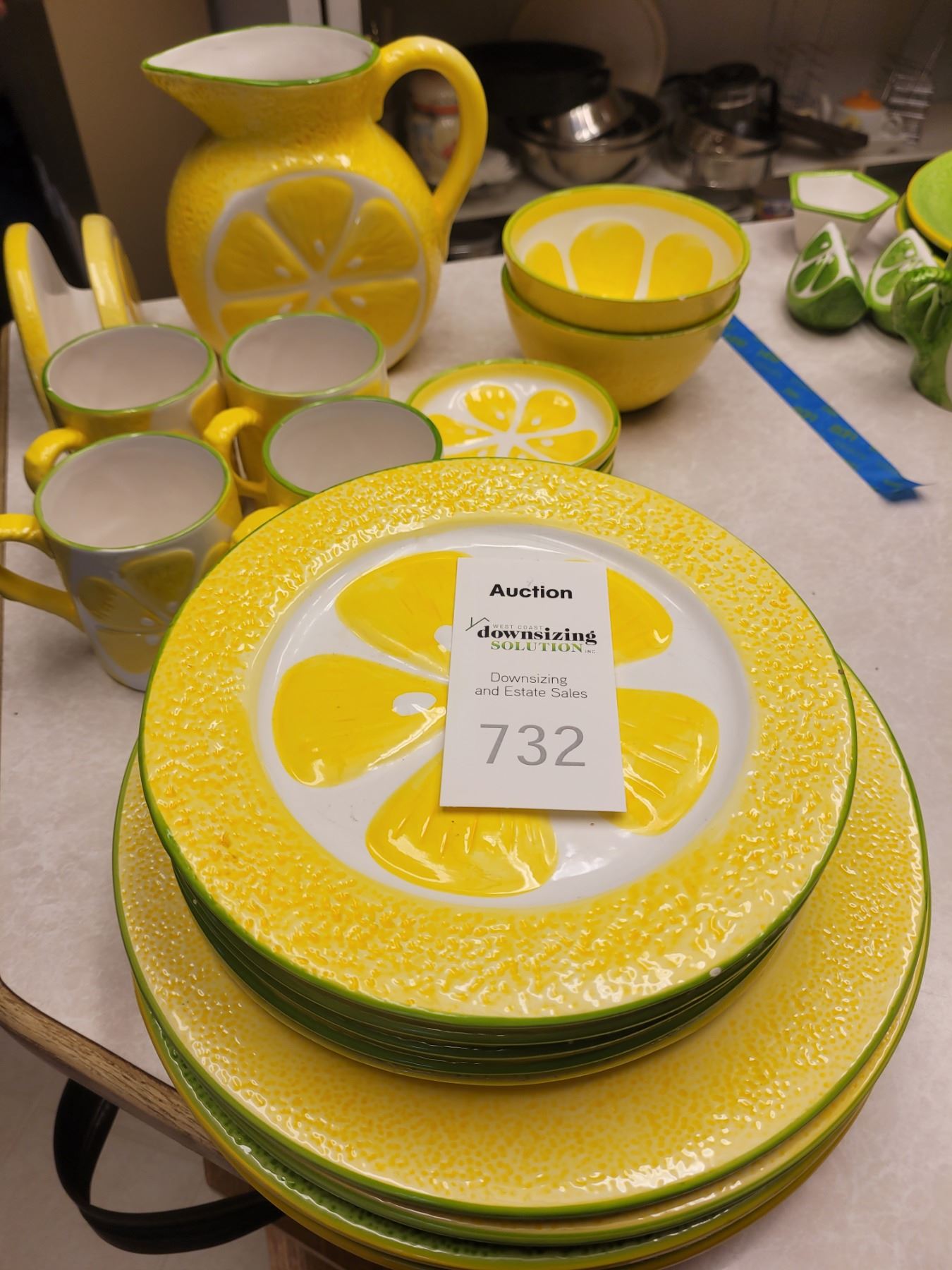 Ceramic set includes 5 dinner, 5 salad plates, pitcher, napkin holder, 4 mugs, two sauce bowls, 4 condiment dishes.some small chips Bring packing material. Pick up 9-10
