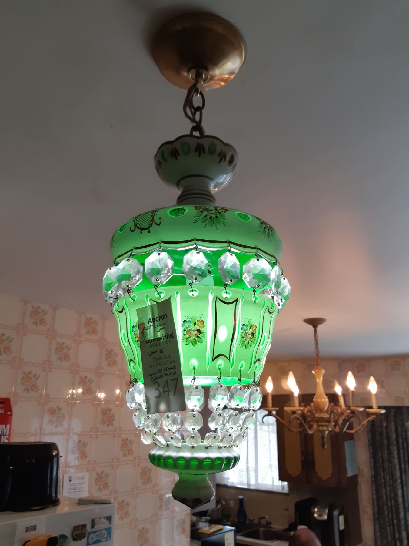 Painted green glass in milk white with coloured flowers, cut glass crystal, 16" fixture will be removed from ceiling before pickup. Pickup at 9 am