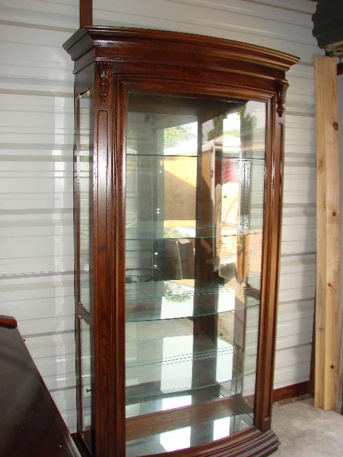 Curved glass front lighted curio cabinet, glass shelves have plate grooves.39"Lx81"Hx13"D