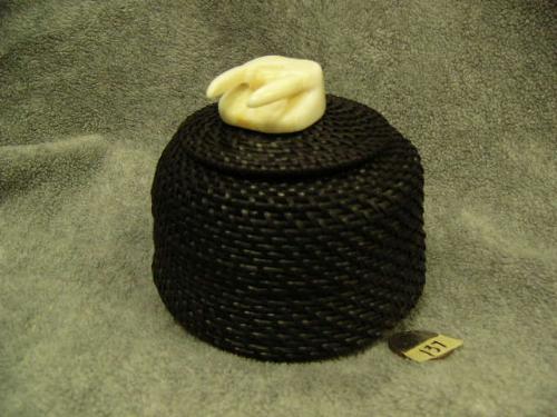 Lilly Hank baleen basket with ivory walrus head finial- 4" tall, approx. 4-3/4" diameter at base