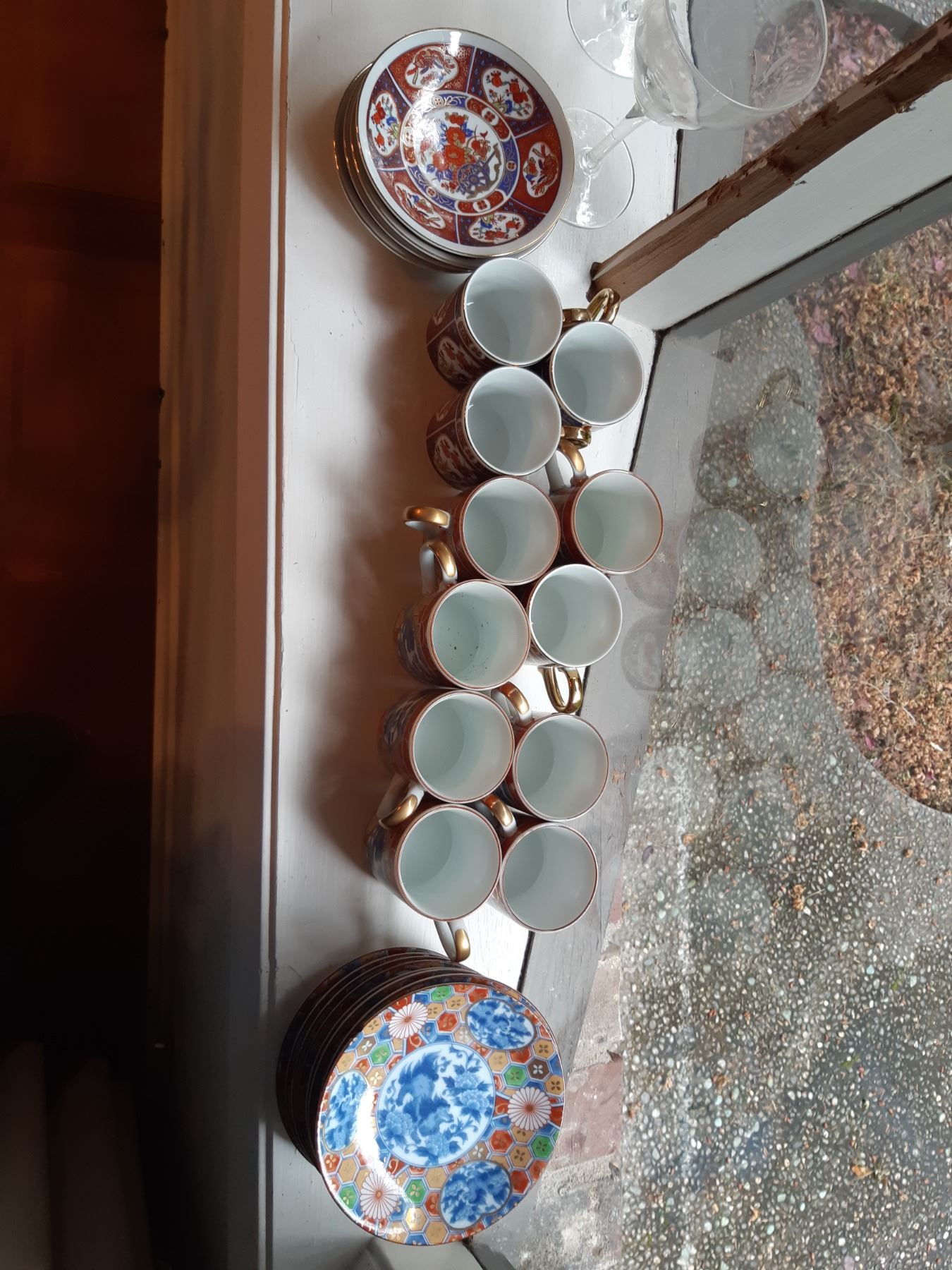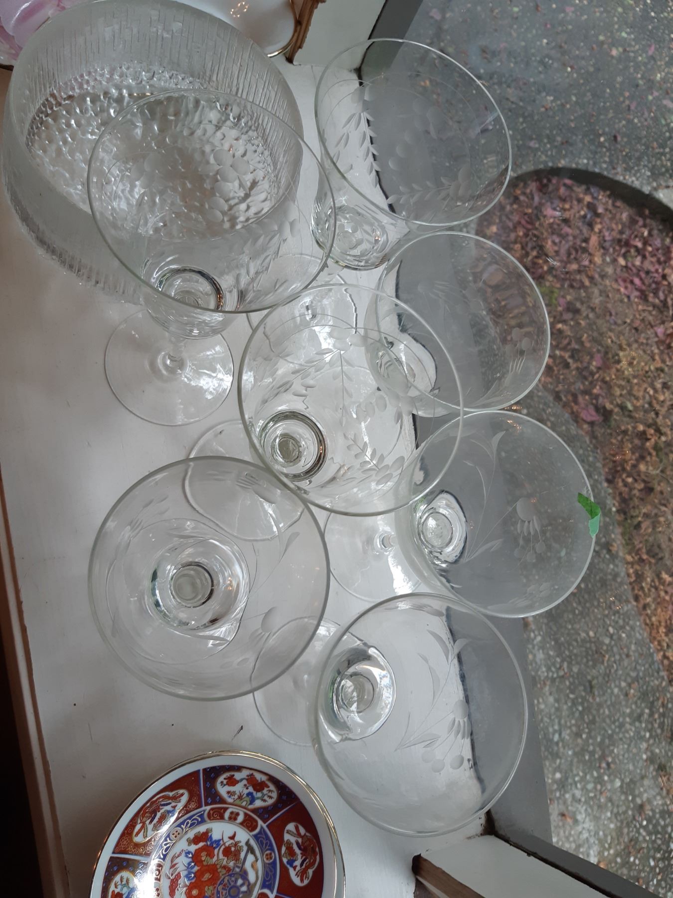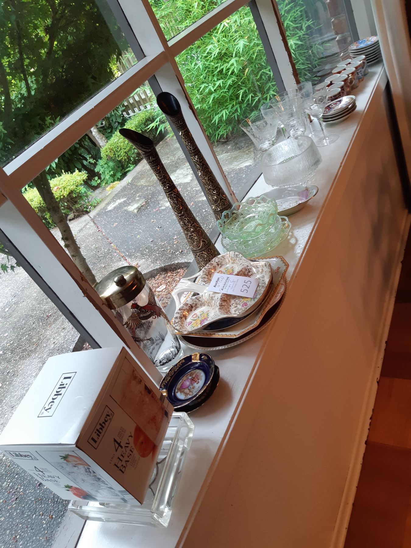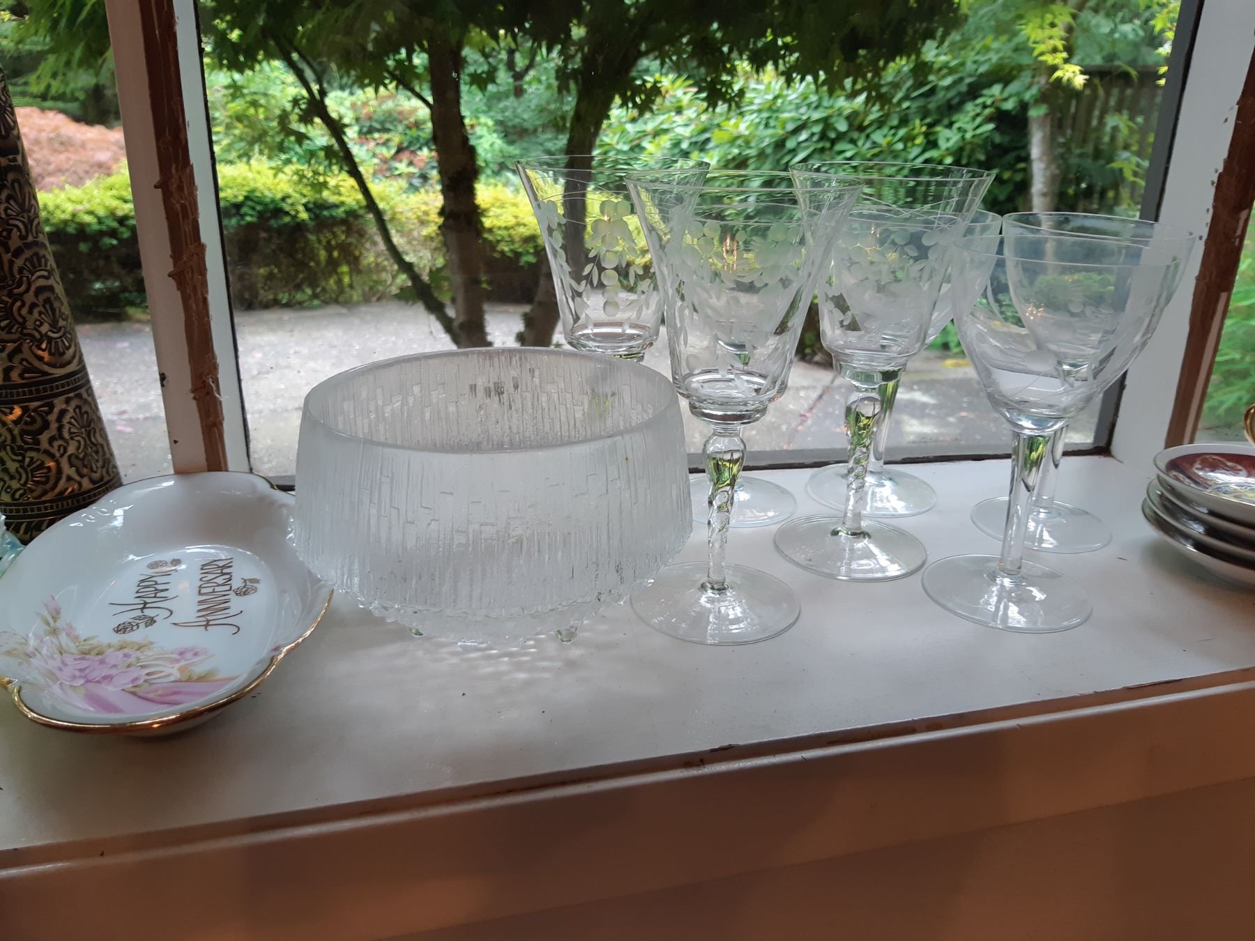 Limoges 5" & 4" wall plates, 2 x black and gold vases 16" , Antique serving plates, green and blue opal depression glass dishes. Japanese Teecups and saucers, one set for 4 and the other has7 cups and 8 saucers. Wine glasses, one has a chip and more. Bring packing supplies and pickup at 9 am