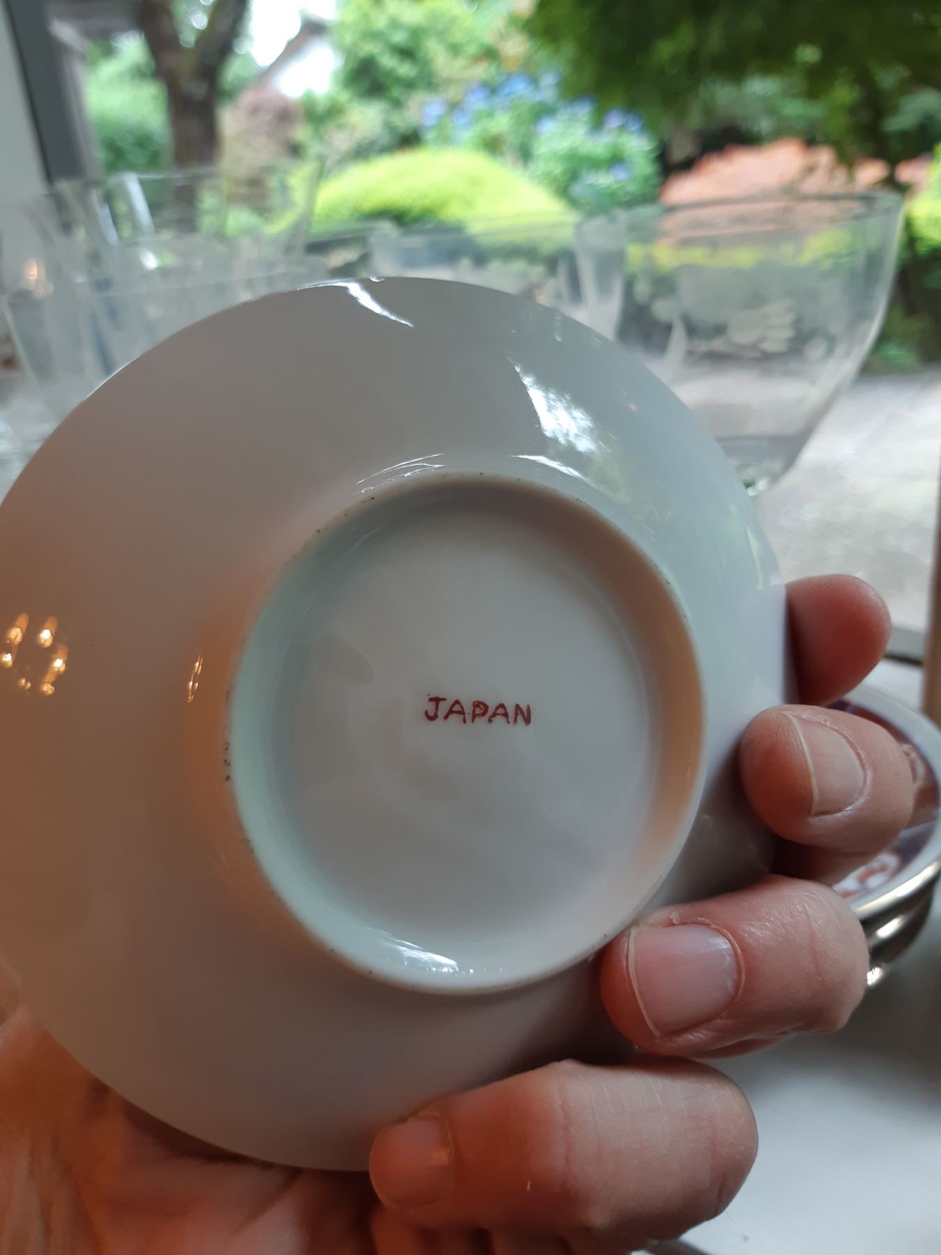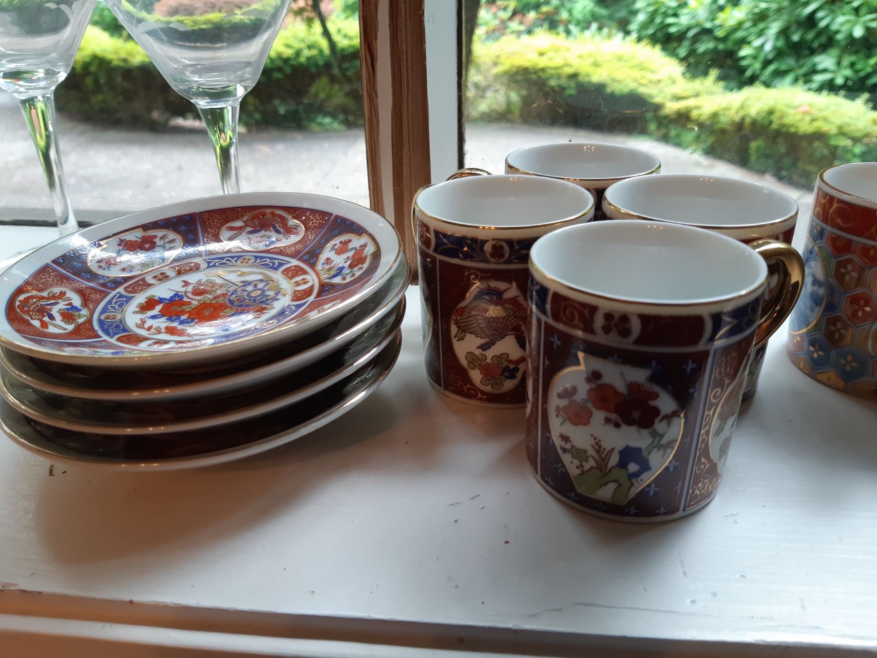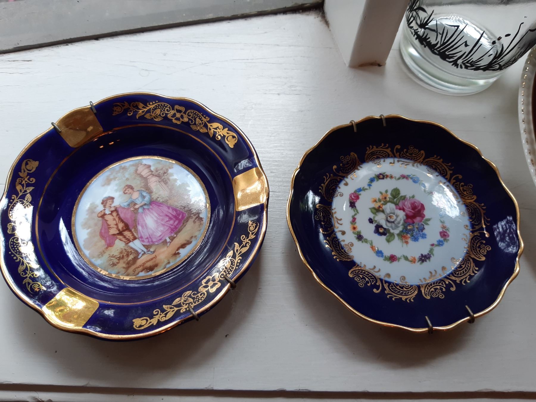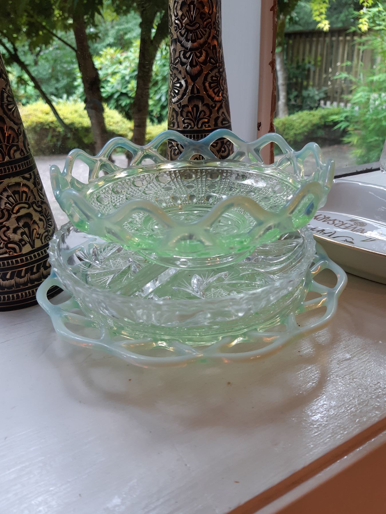 Limoges 5" & 4" wall plates, 2 x black and gold vases 16" , Antique serving plates, green and blue opal depression glass dishes. Japanese Teecups and saucers, one set for 4 and the other has7 cups and 8 saucers. Wine glasses, one has a chip and more. Bring packing supplies and pickup at 9 am