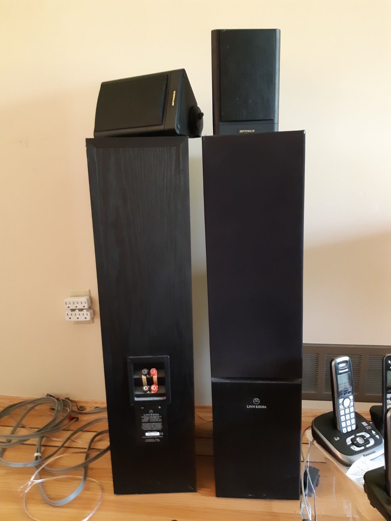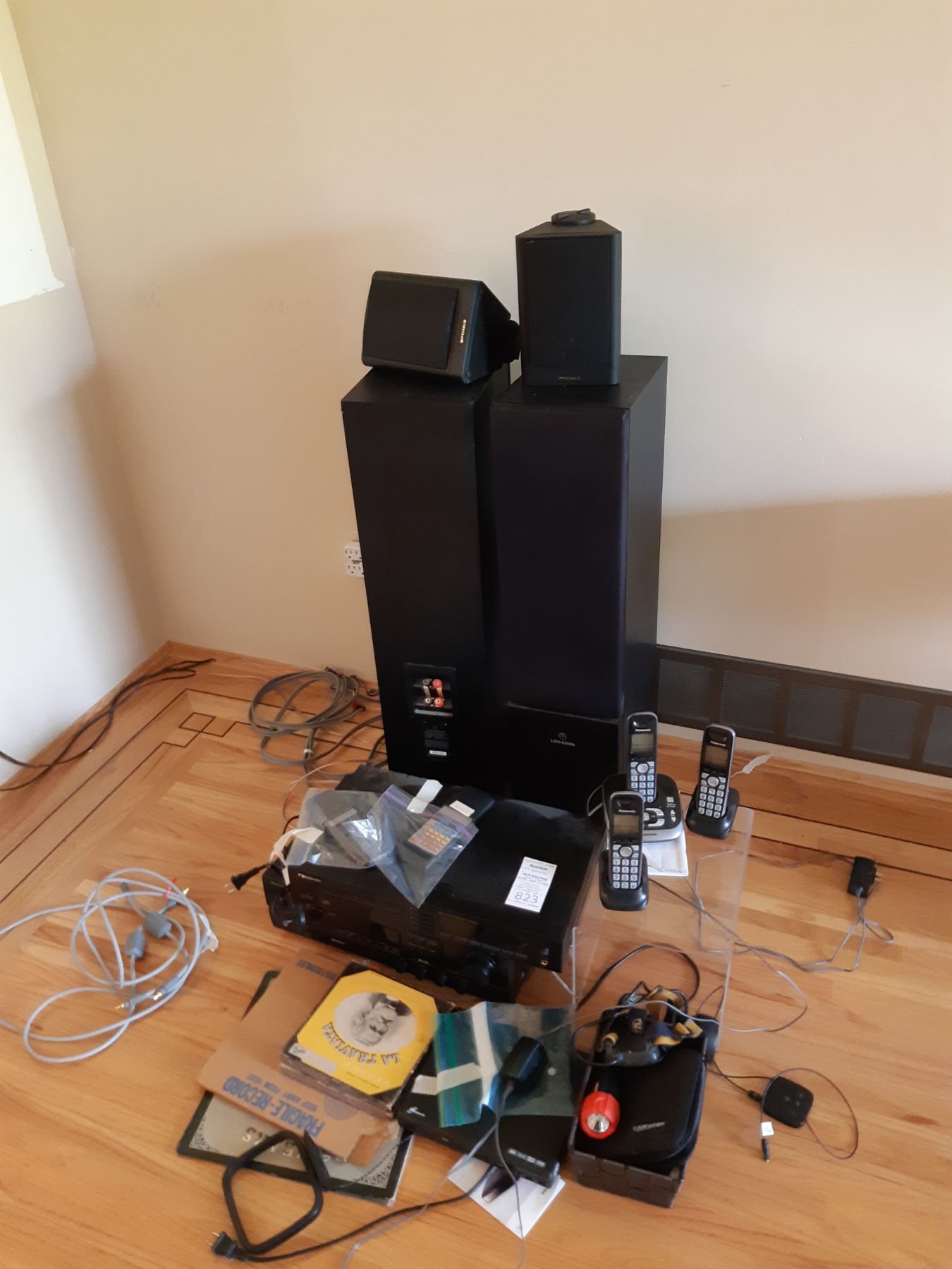 Lin Keosa Speakers 32" ea/ Denon receiver Dra-375rd/ Nakamichi disc player serial v66204194, media sonic DVD player model HW210AX, Phonak tv connector, Panasonic phones all untested bring packing materials pick up at 9 am