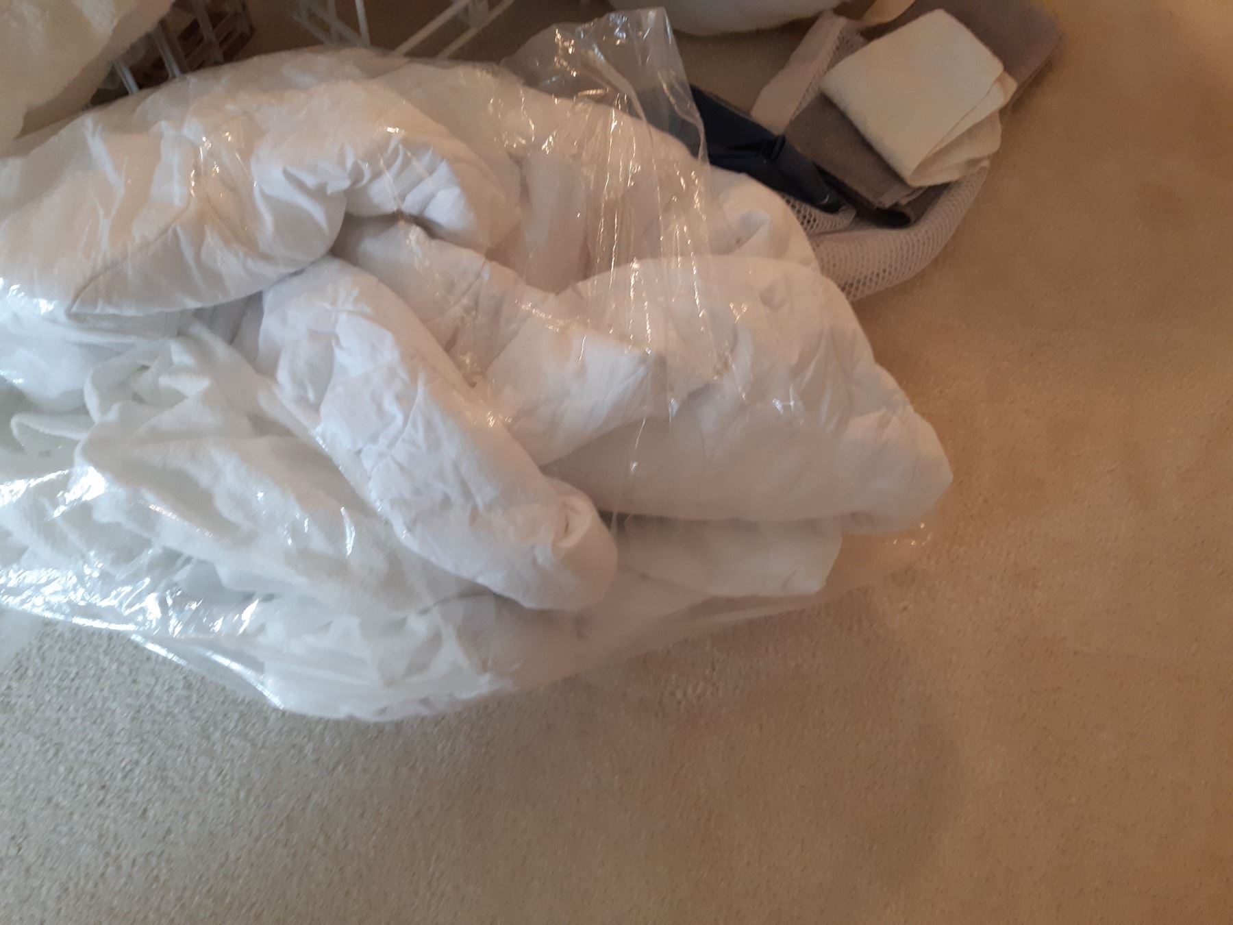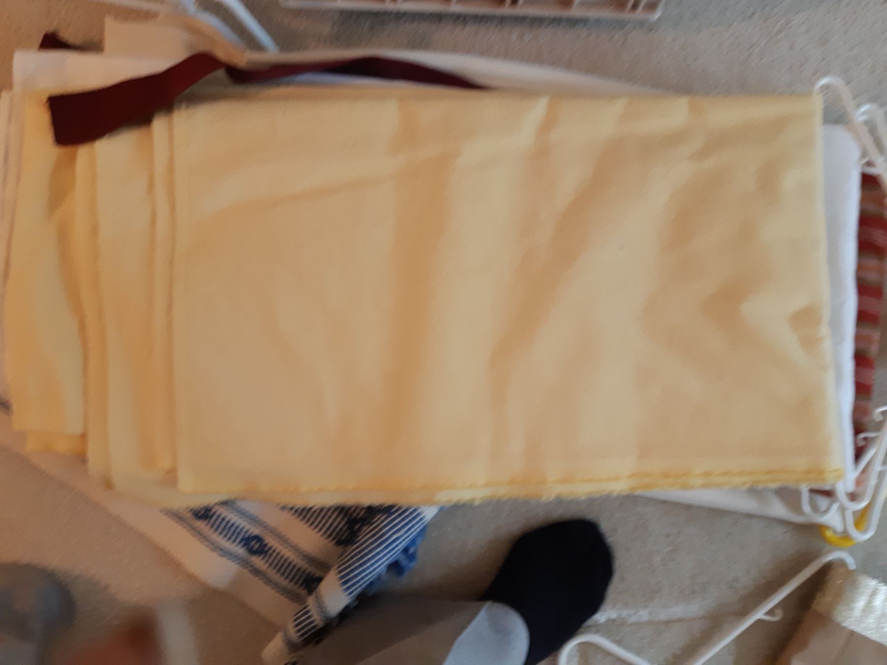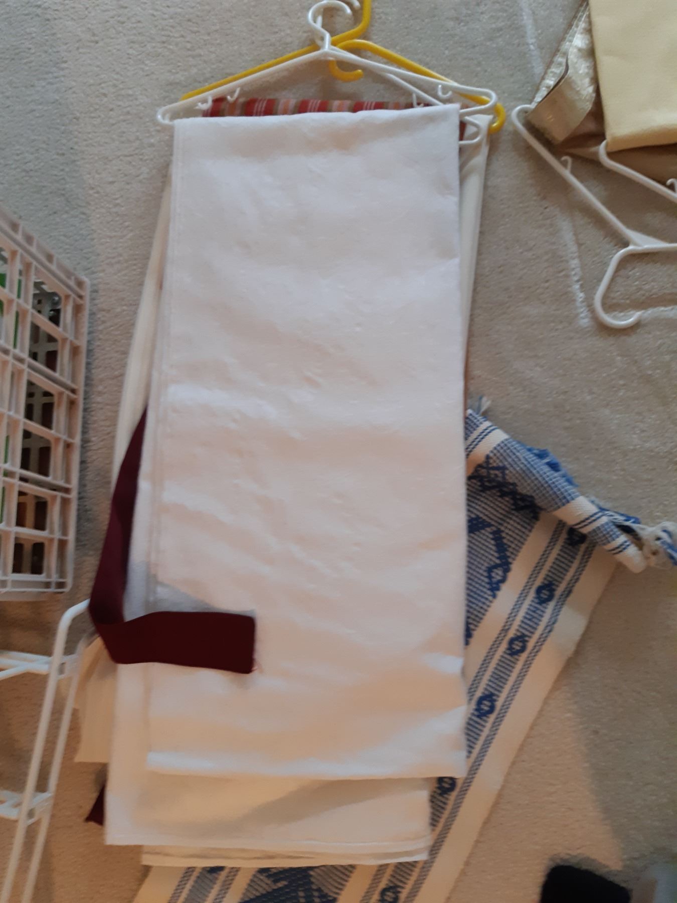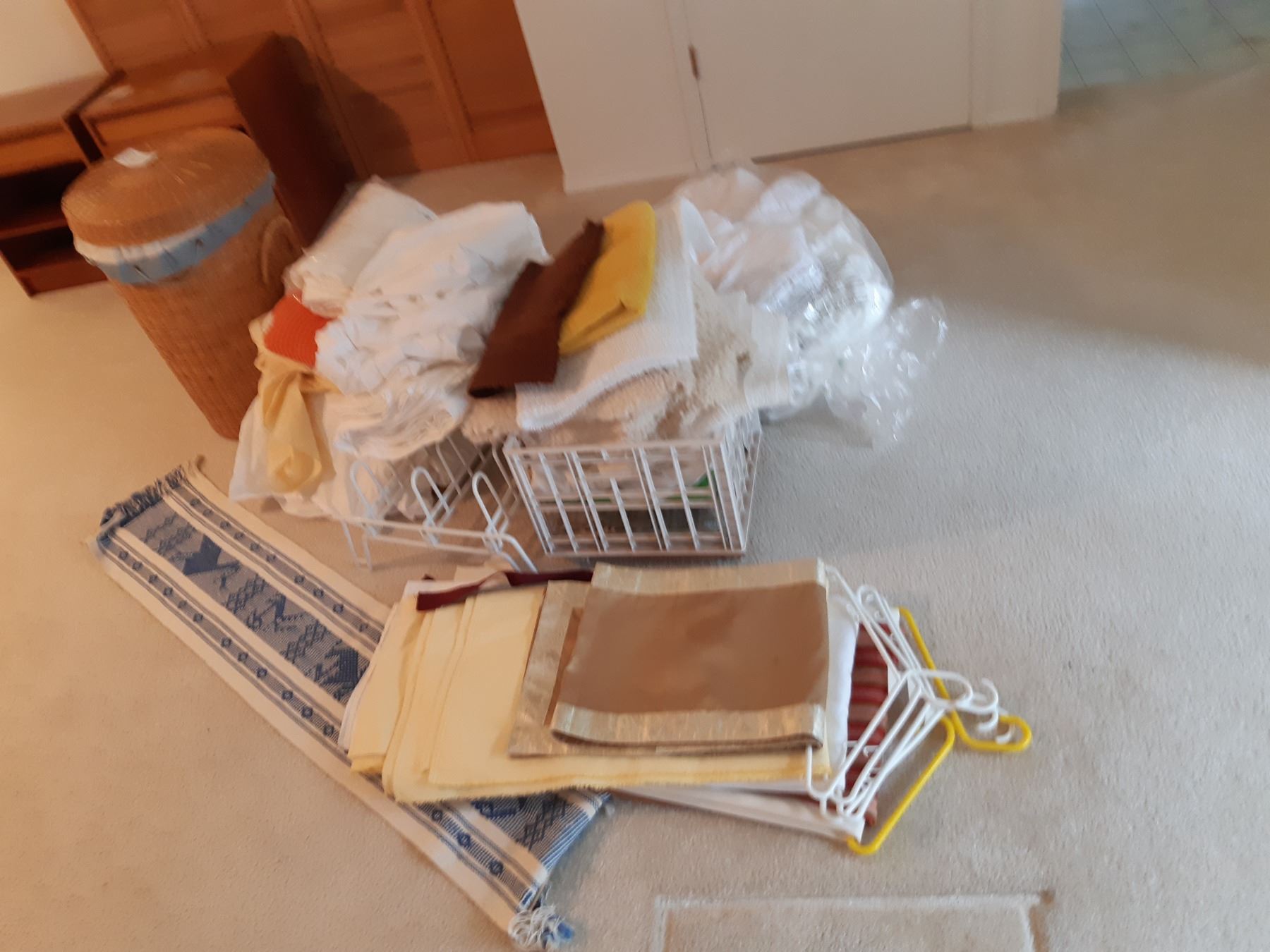 King size linen includes sheets, mattress covers, bed skirts. Table covers, wicker hamper 25", and more. Bring boxes. Pickup at 9 am.
