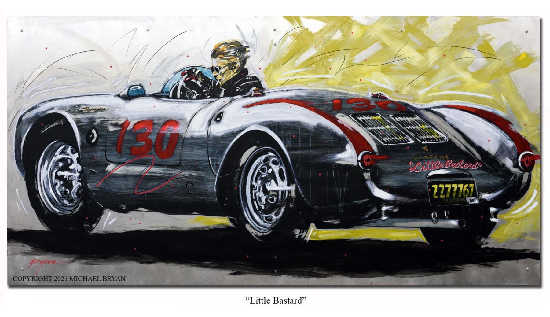 that sure looks like James Dean whizzing through town in his unique "Little Bastard'. Michael Bryan pays homage to the car & the star in this 20x40" handworked giclee on canvas, numbered 1/1 Unique.