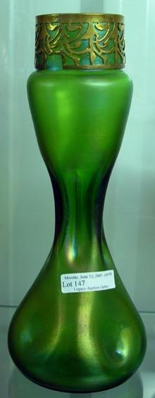 Loetz 10 Inch Pinched Green Iridescent Art Glass Vase, Ca. 1900
