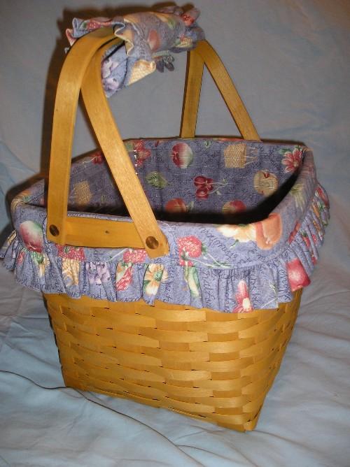 Grandma Bonnies two pie basket with signature burned in handle in celebration of her 90th birthday. It has a fabric liner, handle cover, plastic protector, and wood divider.