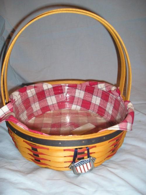 2002 casserole basket with fabric liner, plastic protector and red/white/blue tie-on.