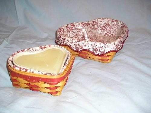 Love Letters heart shaped sweetheart baskets and includes fabric liners, plastic protectors and one candle in Longaberger ceramic holder.
