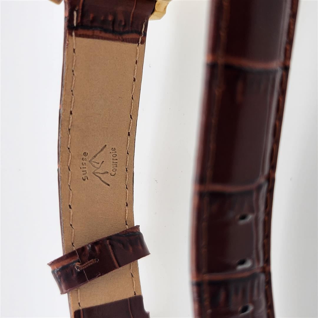 This is a classic Longines rectangular dress watch featuring a gold case and a sleek minimalist design. The watch includes a small seconds subdial at the 6 o'clock position. Paired with a dark brown leather strap with a textured finish, this timepiece exudes vintage elegance, ideal for formal occasions or collectors seeking timeless designs.