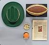 Collection of various Charlie O. Finley items as follows: "Official Charles O. Finley Baseball" single-signed orange baseball in black pen with stand; "Rawlings Official Intercollegiate" football signed in black marker "To Jim, Best Regards Charles O Finley". Signature grades a 6-7; 3-1/2" beige pin with "Charlie O" and the mule mascot in green; August 18, 1975 Time Magazine with Charlie on the cover; October 23, 1989 Sports Illustrated magazine with an article about Charlie; and Charlie's personal green cowboy hat similar he was wearing in the Time Magazine cover photo. Accompanied by a LOA by JSA.