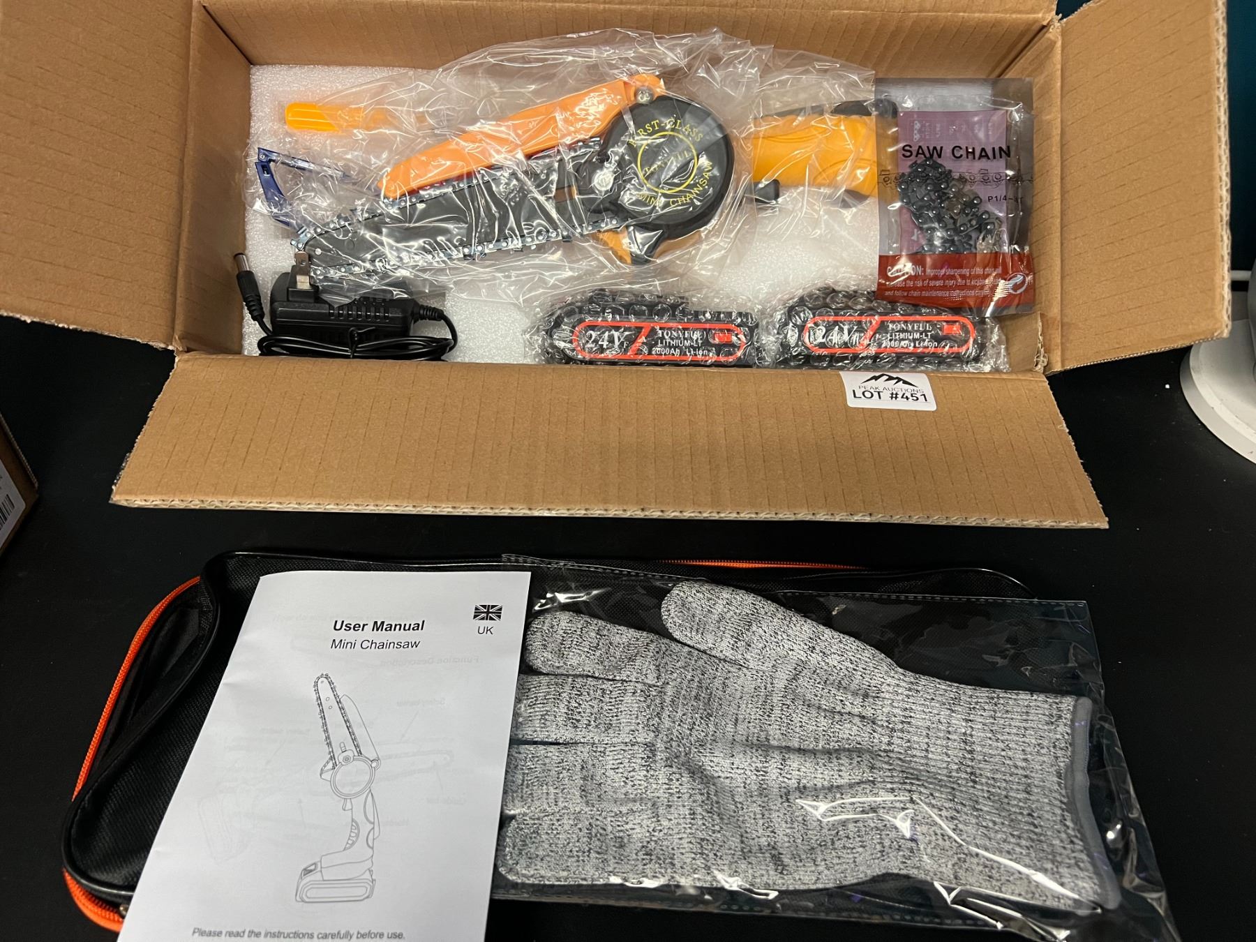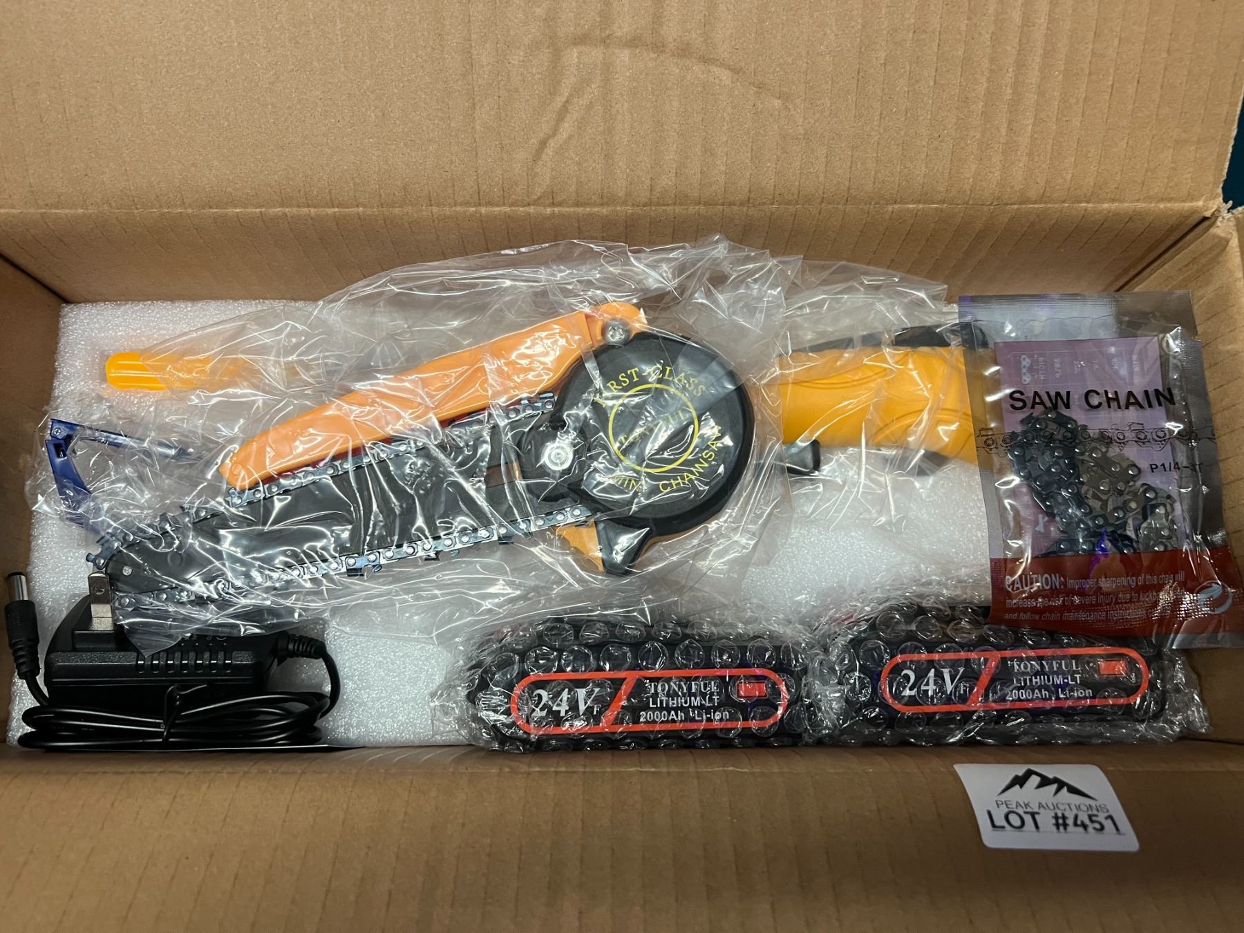 - includes 2 batteries, gloves, charger, 2 chains, storage bag, etc.