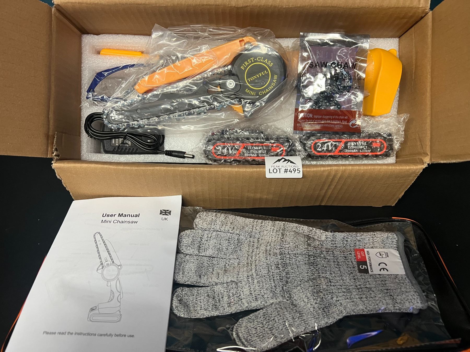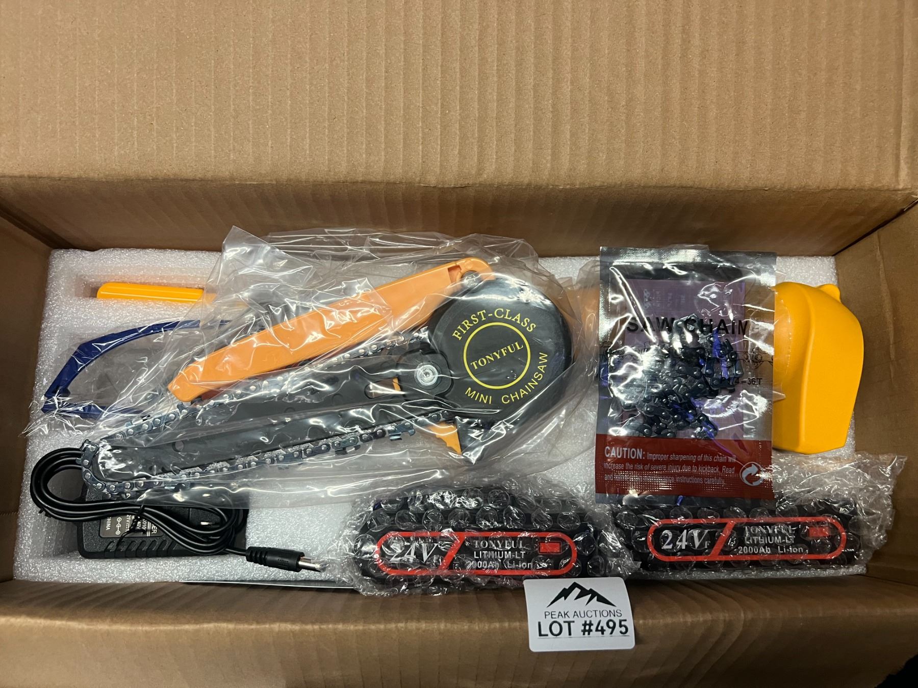 - includes 2 batteries, gloves, charger, 2 chains, storage bag, etc.
