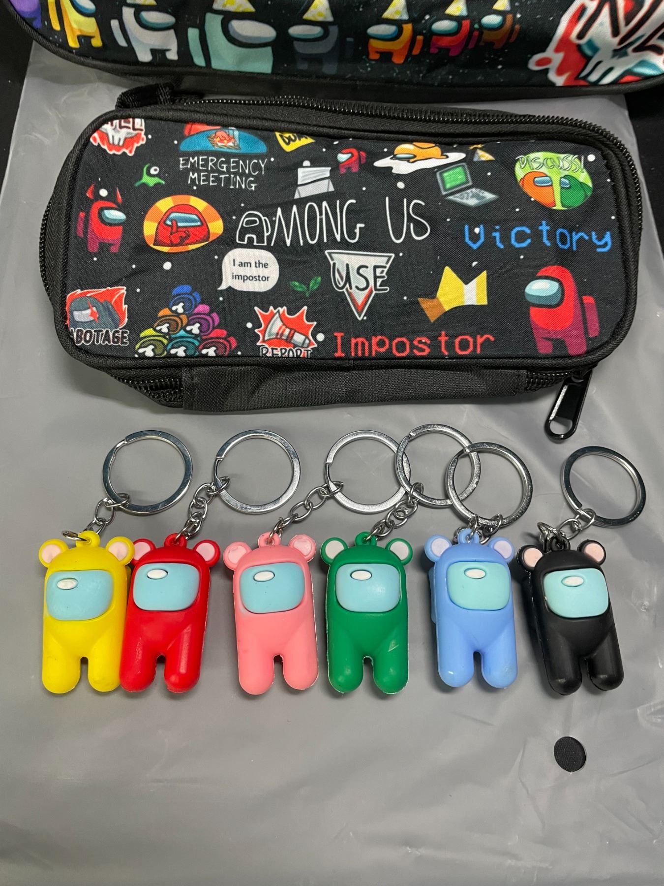 - includes pencil pouch and assorted among us figure keychains
