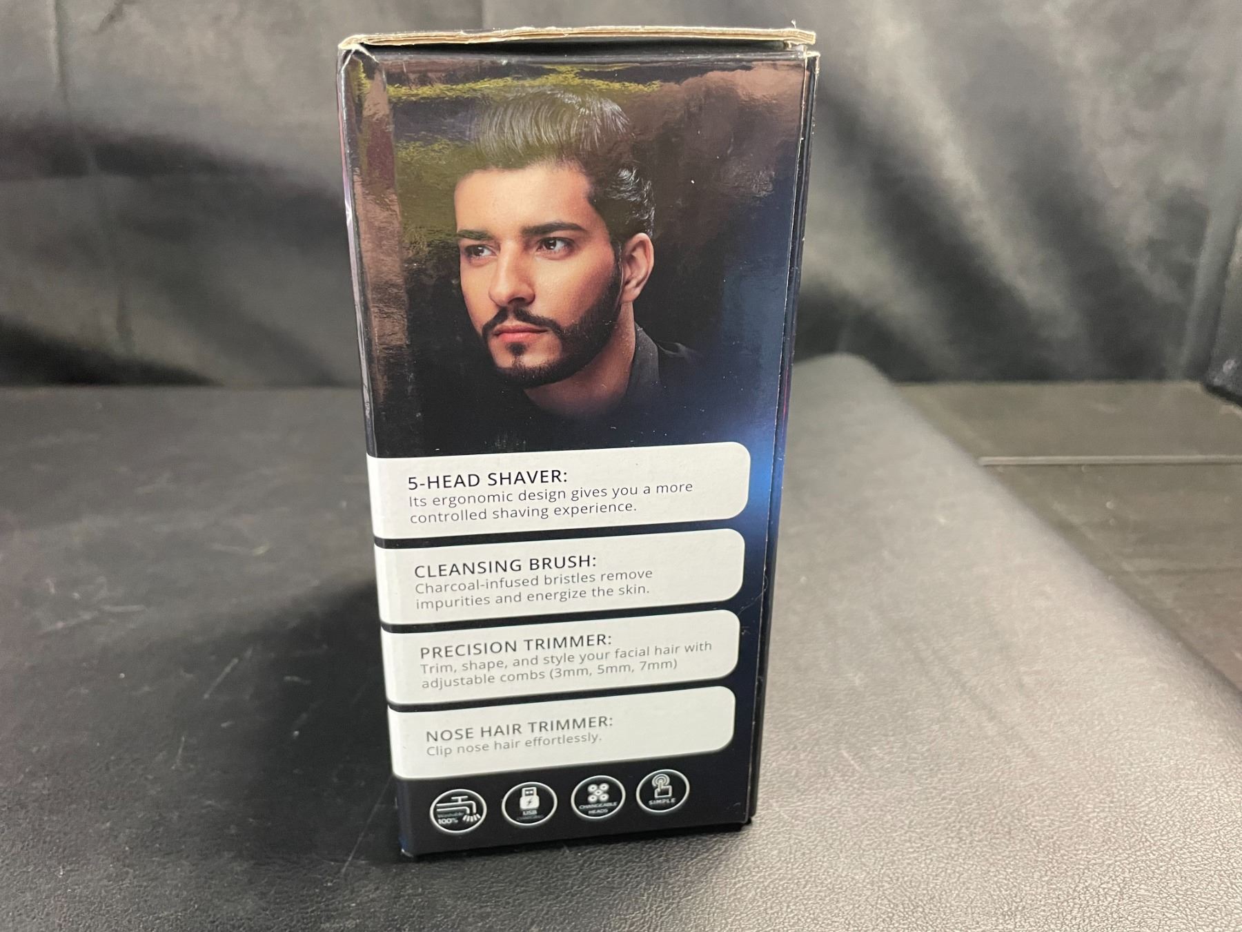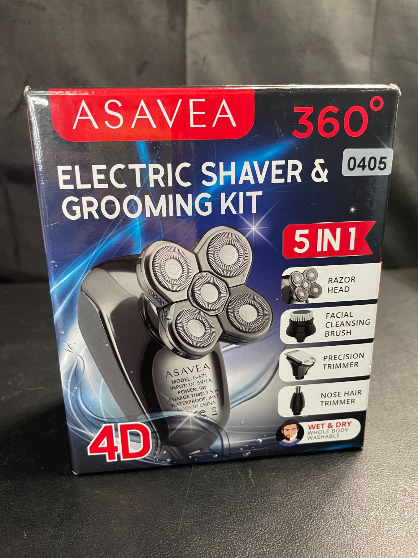- 5 in 1 electric shaver; razor head for hair shaving, facial cleansing brush attachment, precision trimmer attachment, and nose hair trimmer