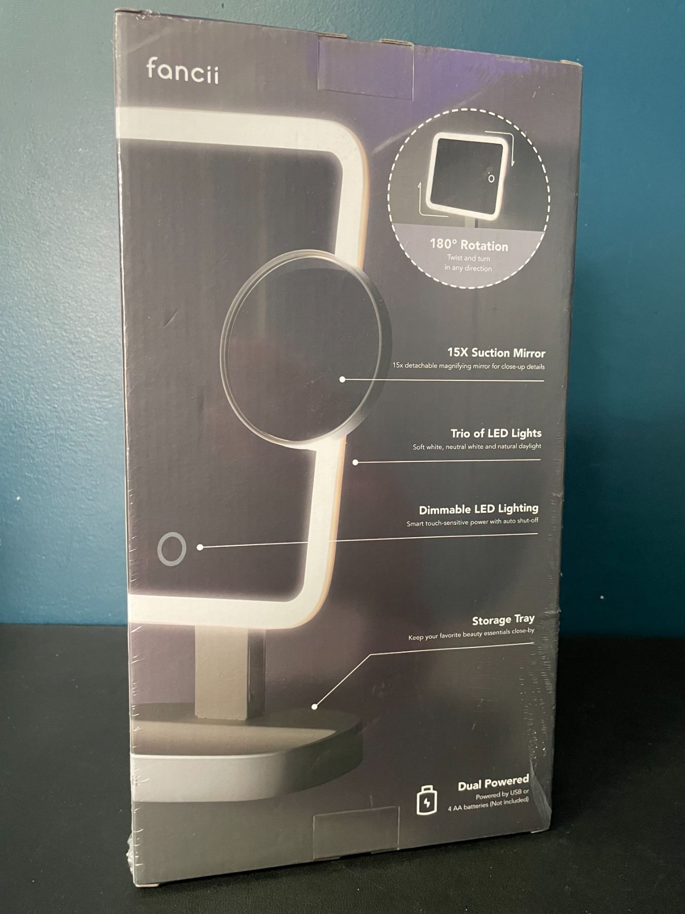 - Fancii LED makeup vanity mirror with 3 light settings and 15X magniciation