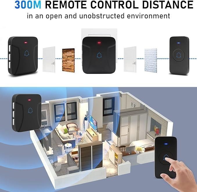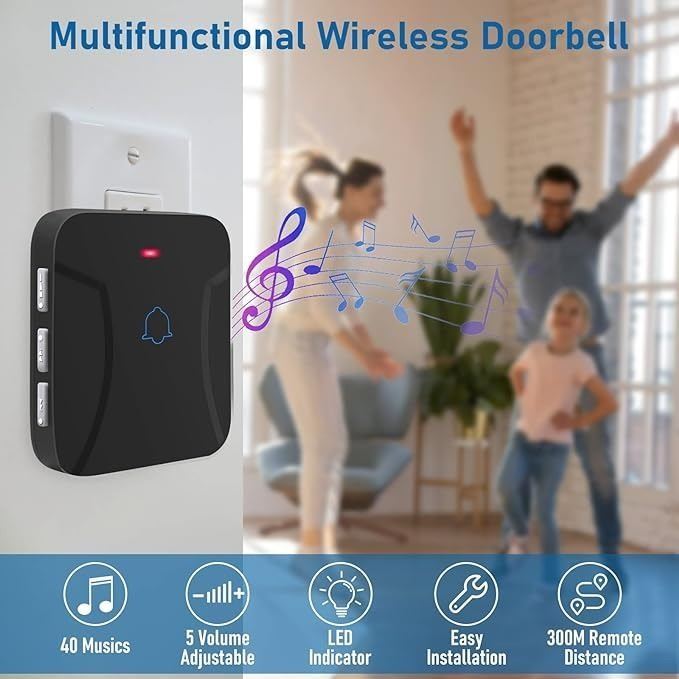 ERAMONG Wireless Doorbell, Waterproof Doorbell Kit, 1000ft/300m Operating Range Door Bell with 5 Volume Levels, 40 Chimes and Led Flash for Home, Office, School (1 Receiver x 1 Push Button, Black)