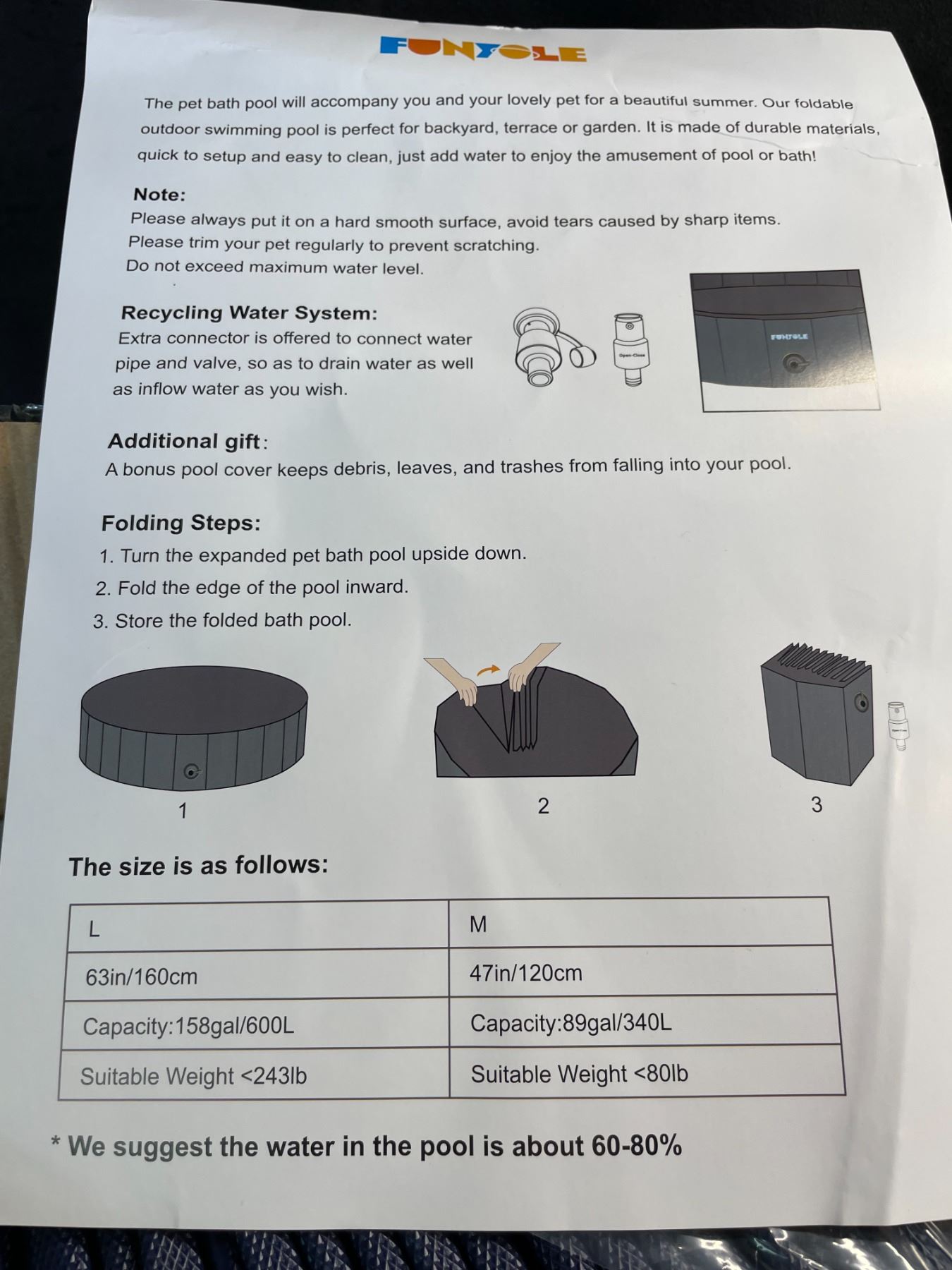 Lot of 1 Funyole Foldable Dog Pool with Pool Cover - 63 inch - Brand New! Great for Pets or Kids
