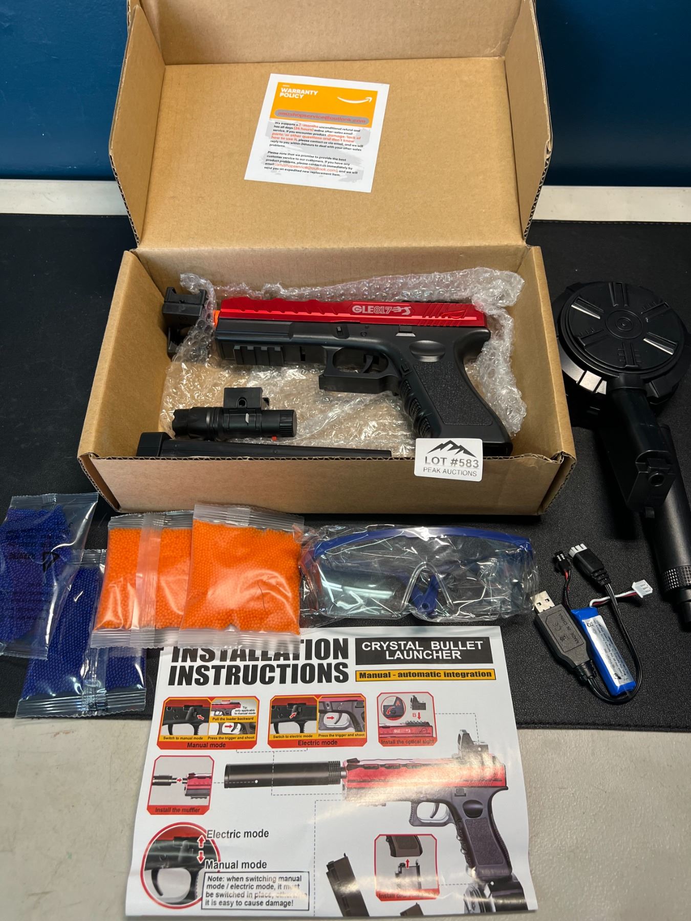 - electric gel ball blaster gun kit; includes ammo, goggles optical sight, and rechargebale battery for automatic firing
