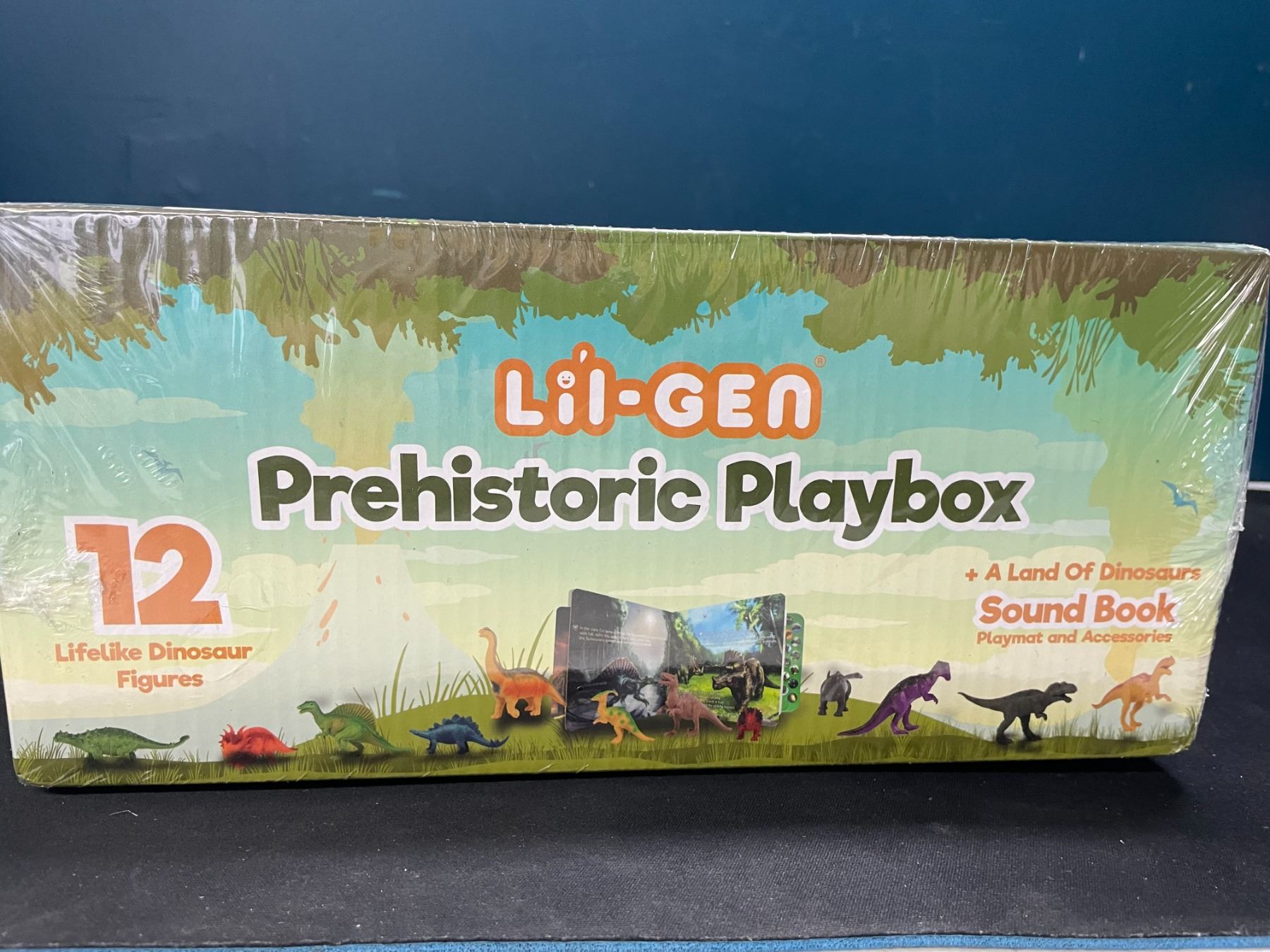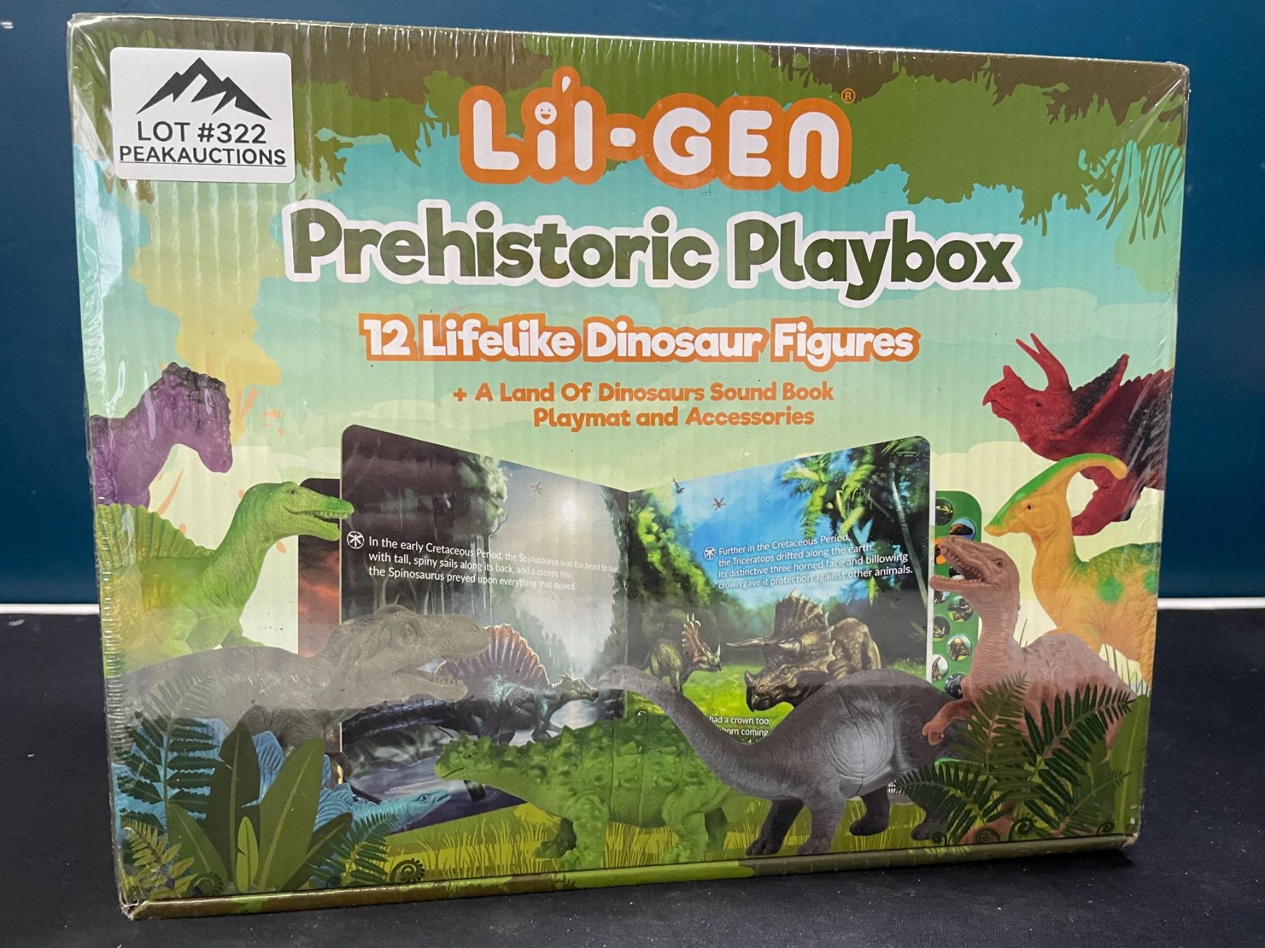 Lot of 1 Lil-Gen Prehistoric Playbox Toy Set - Includes 12 Dinosaur Figures, Sound Book & Playmat!