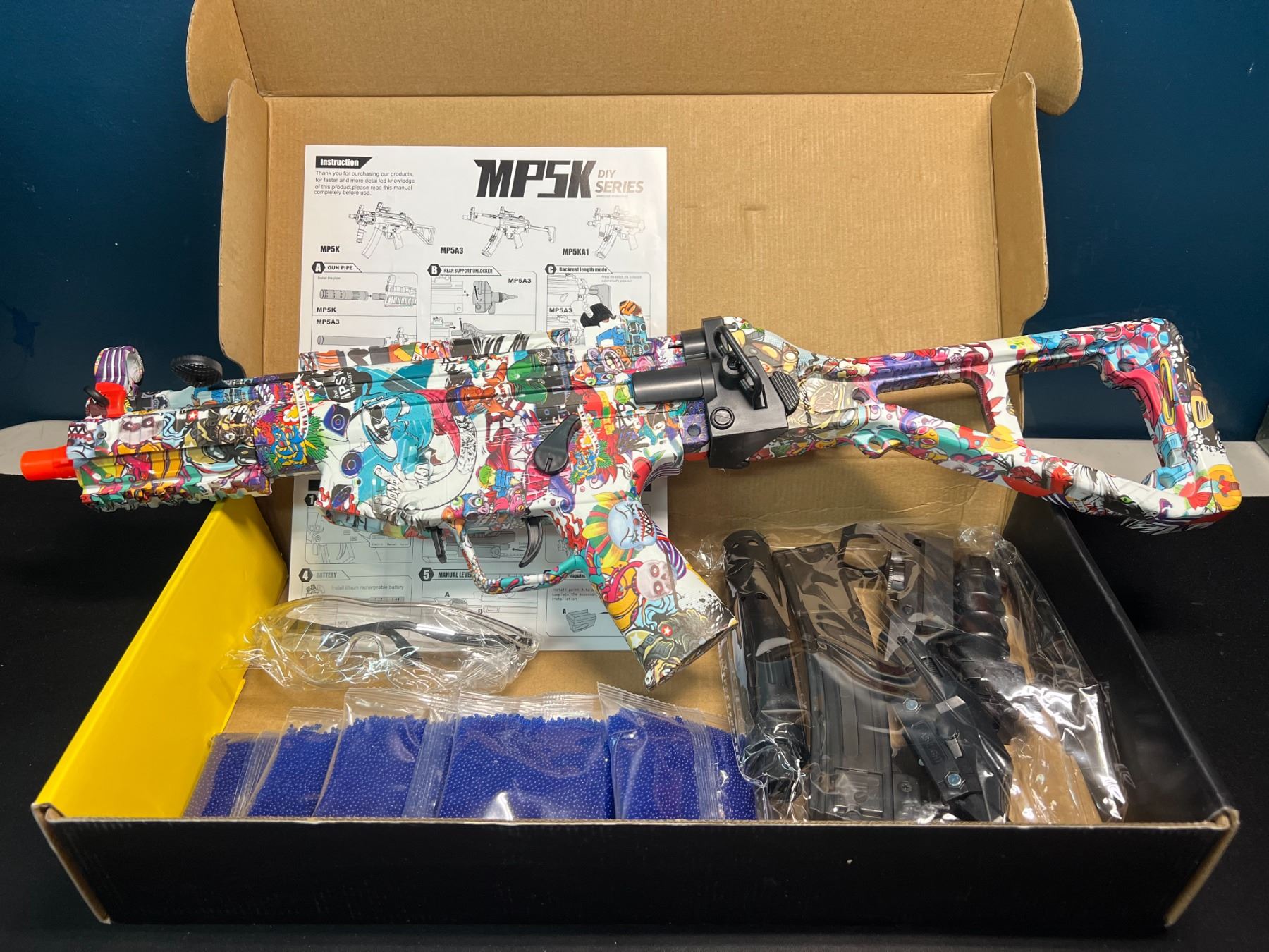 - includes gel ball beads (ammo), glasses, various gun attachments, etc.