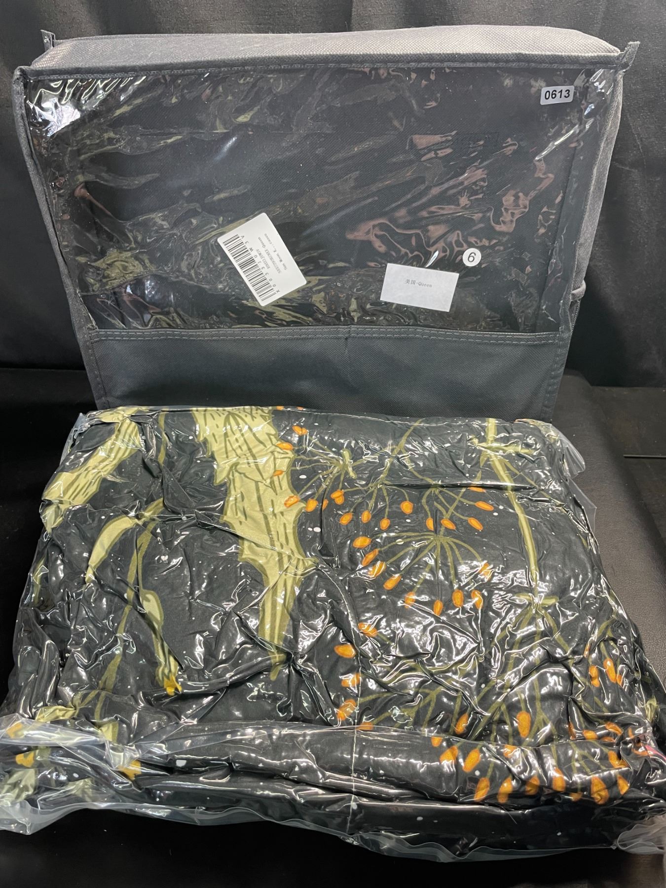 - queen size (unsure if comforter or duvet cover set; is brand new vacuum sealed)