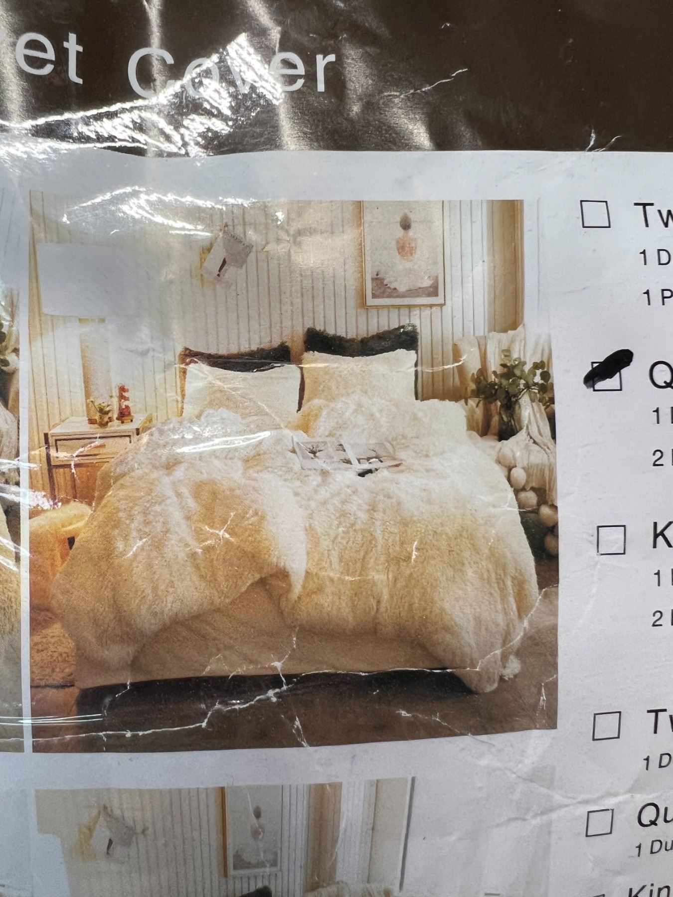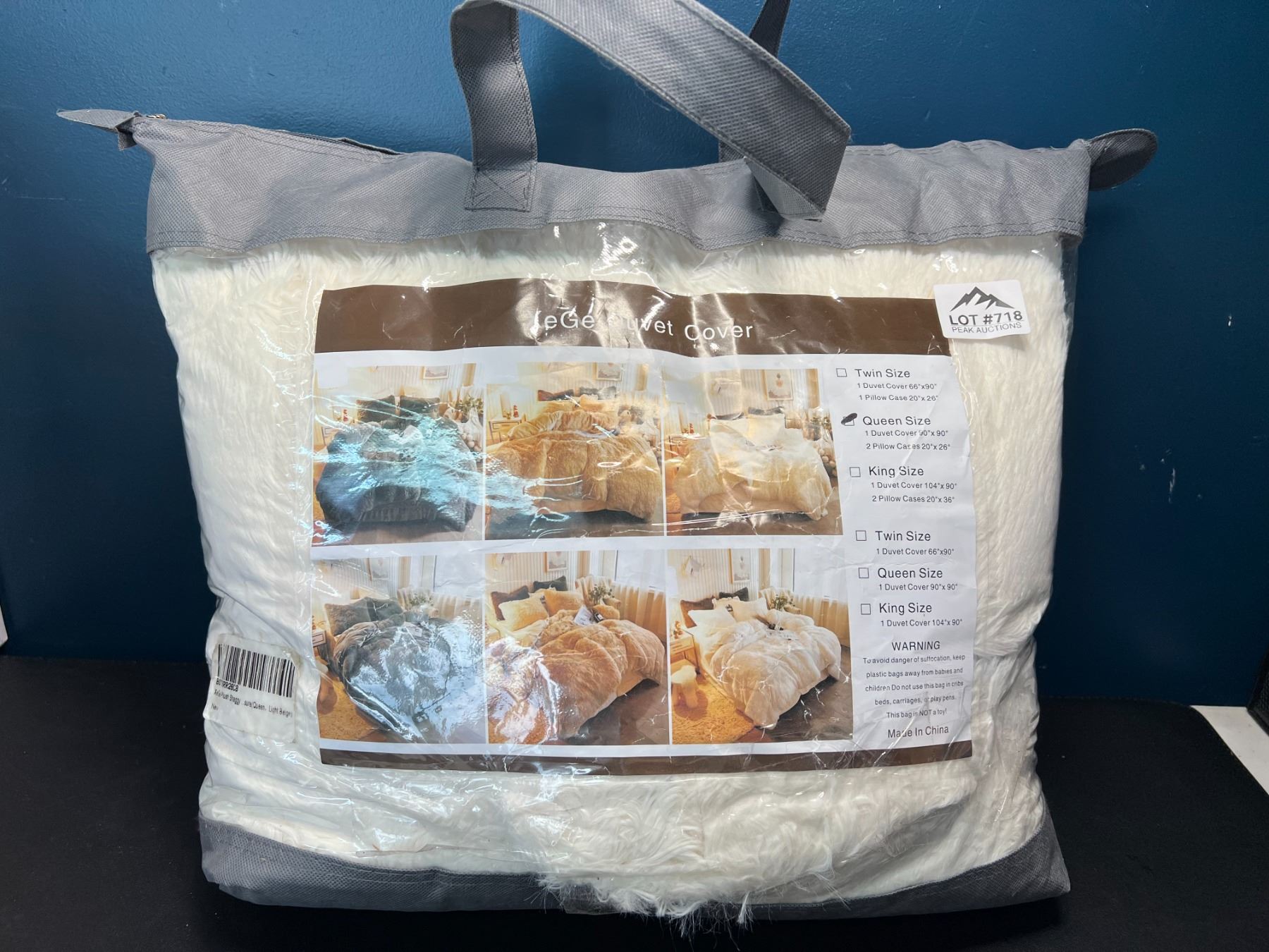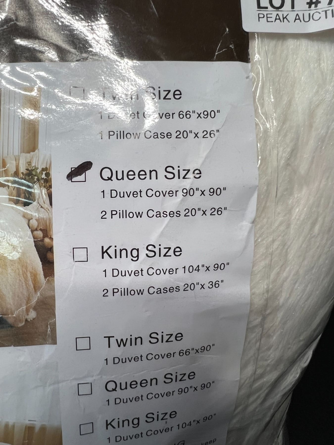 - 90x90 inch white fuzzy duvet cover (Queen Size) & 2x fuzzy pillowcases (20 x 26 inch)