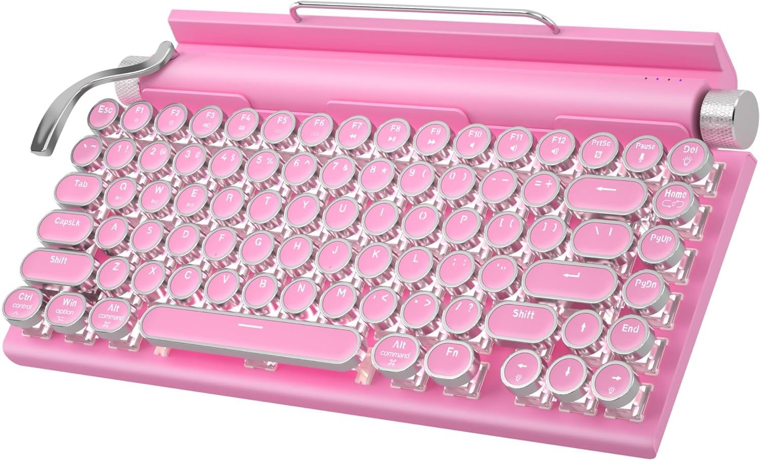 - Retro Typewriter Keyboard Wireless, Mechanical Gaming Vintage Keyboard 83-Key Blue Switches Punk Round Keycap, 14 Modes LED Backlight, Type-C, Bluetooth 5.0,Compatible with PC/Laptop/Pad/Phone, Pink